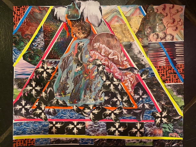 Inspired by the celebration of resilience in Liana’s post, I am sharing a mandala intended to channel the new growth we all have achieved in the face of adversity this year. “Koi Mountain Falls” are the center of this mandala and represent the yellow river falls in the koi legends Liana referred to in her enlightening post on creative solutions. The mandala was created with a collage of the legend symbols interpreted to illustrate the narrative. The tigers are representative of the legend’s “local demons,” and the gods can be seen in the heavens at the top of the mandala, firing lightning bolts down to electrify the koi. Born to be wild, indeed. The triangle was selected as the mandala form to remind me that the mighty strong triad, with three parts all supporting each other equally, was applied to architecture as a creative solution for the collapsing square.