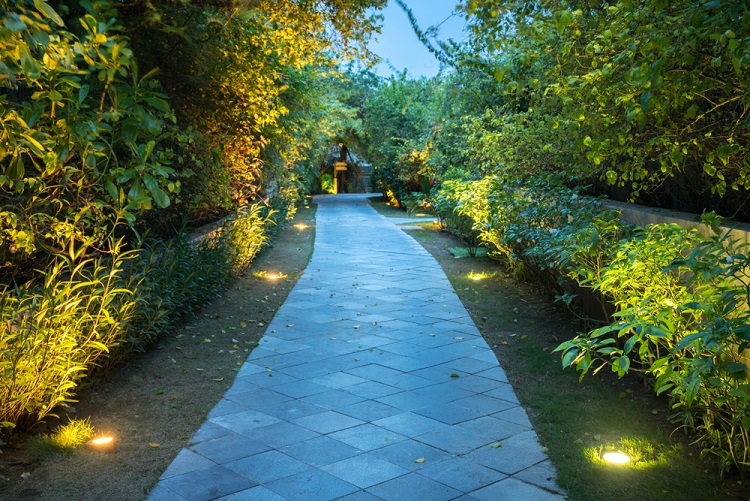 If your landscape has a patio area or just a designated area for people to sit, draped string lights overhead is a classy, simple look that provides the area with just the right amount of light. This designed lighting makes it relaxing and enjoyable to sit under, as it gives the appearance of a starry night sky.