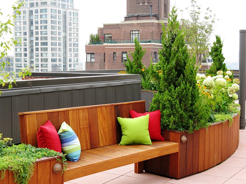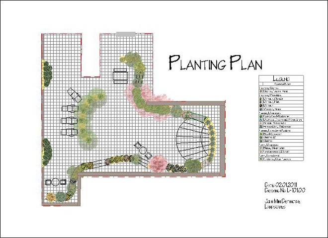 So, the challenge became to design a rooftop garden that offered shade, seasonal plantings, provided interest and prohibited residents from walking on the pebble border. My solution was to introduce a "ribbon" of 30" wide planters interspersed with the same width bench that curved around this hard-angled rooftop that would prevent residents from accessing the pebbled areas.