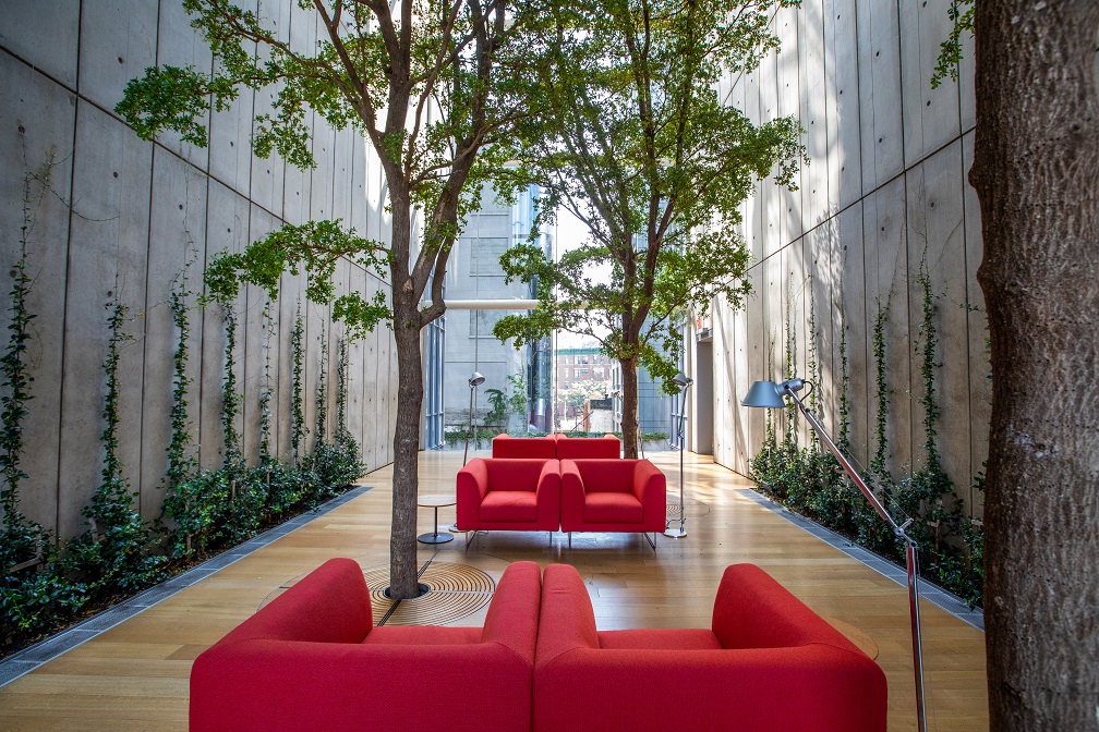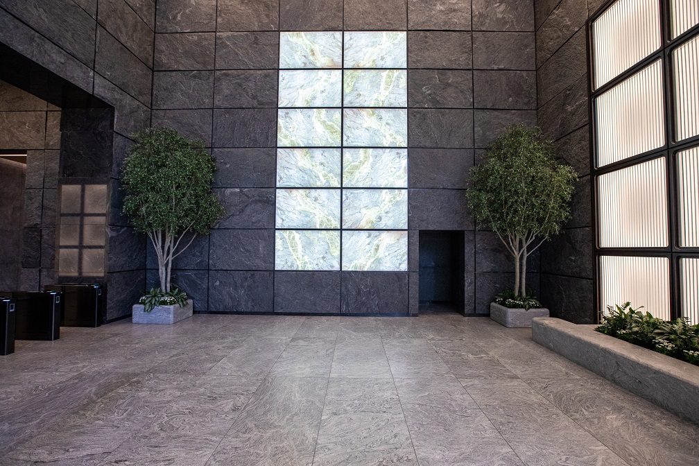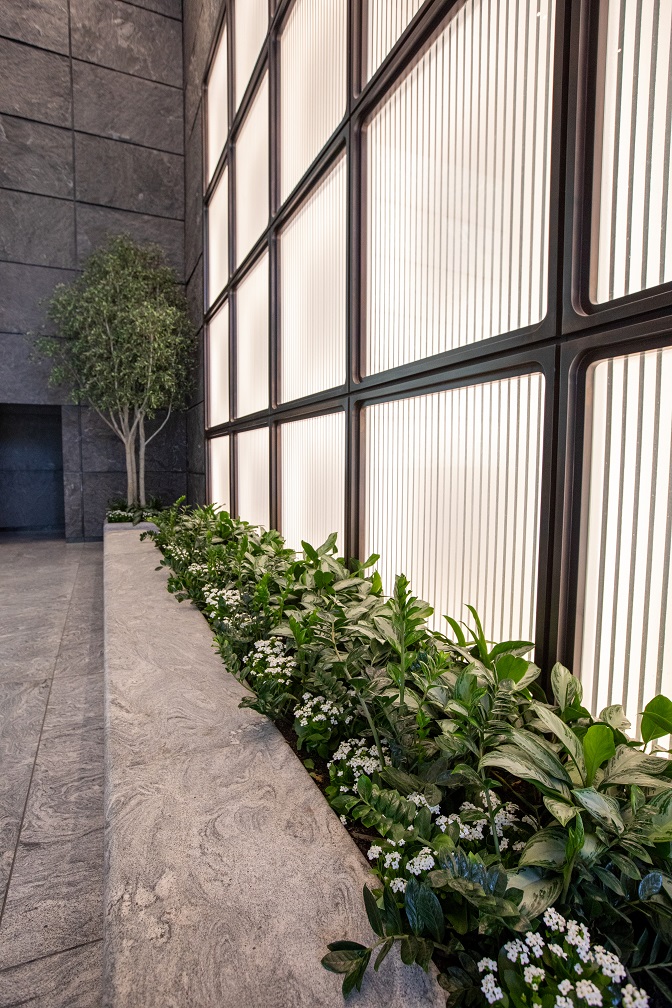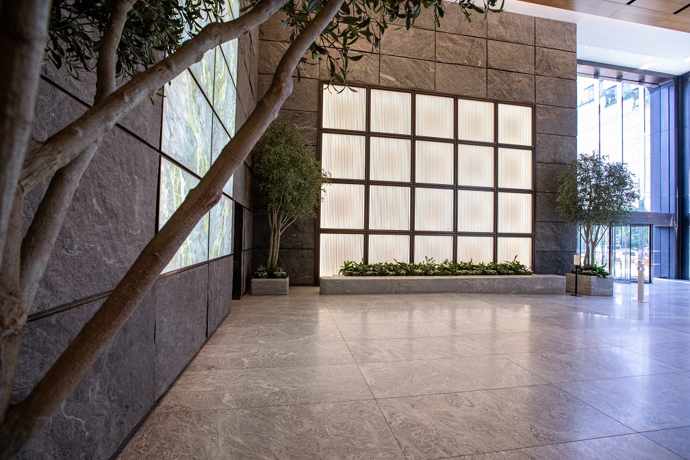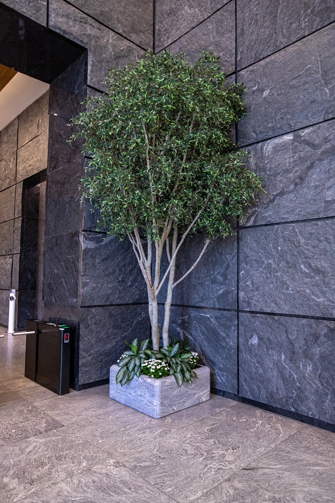 Preserved, replica trees 'breathe' life into this powerful lobby, anchored by live underplantings