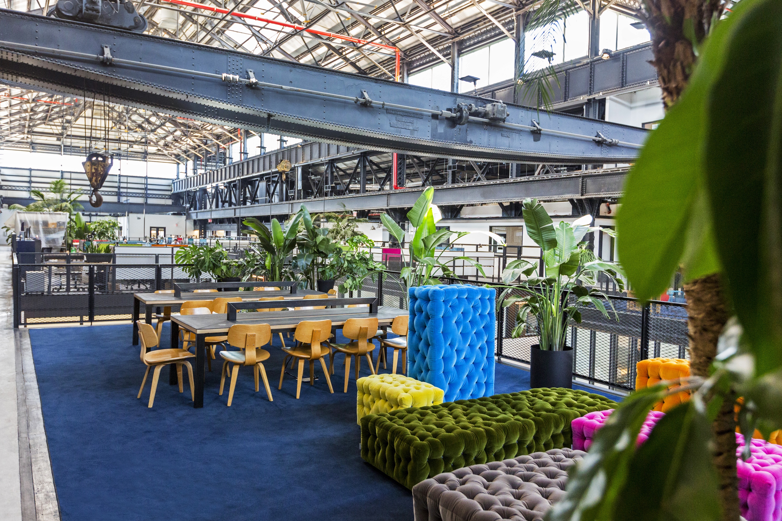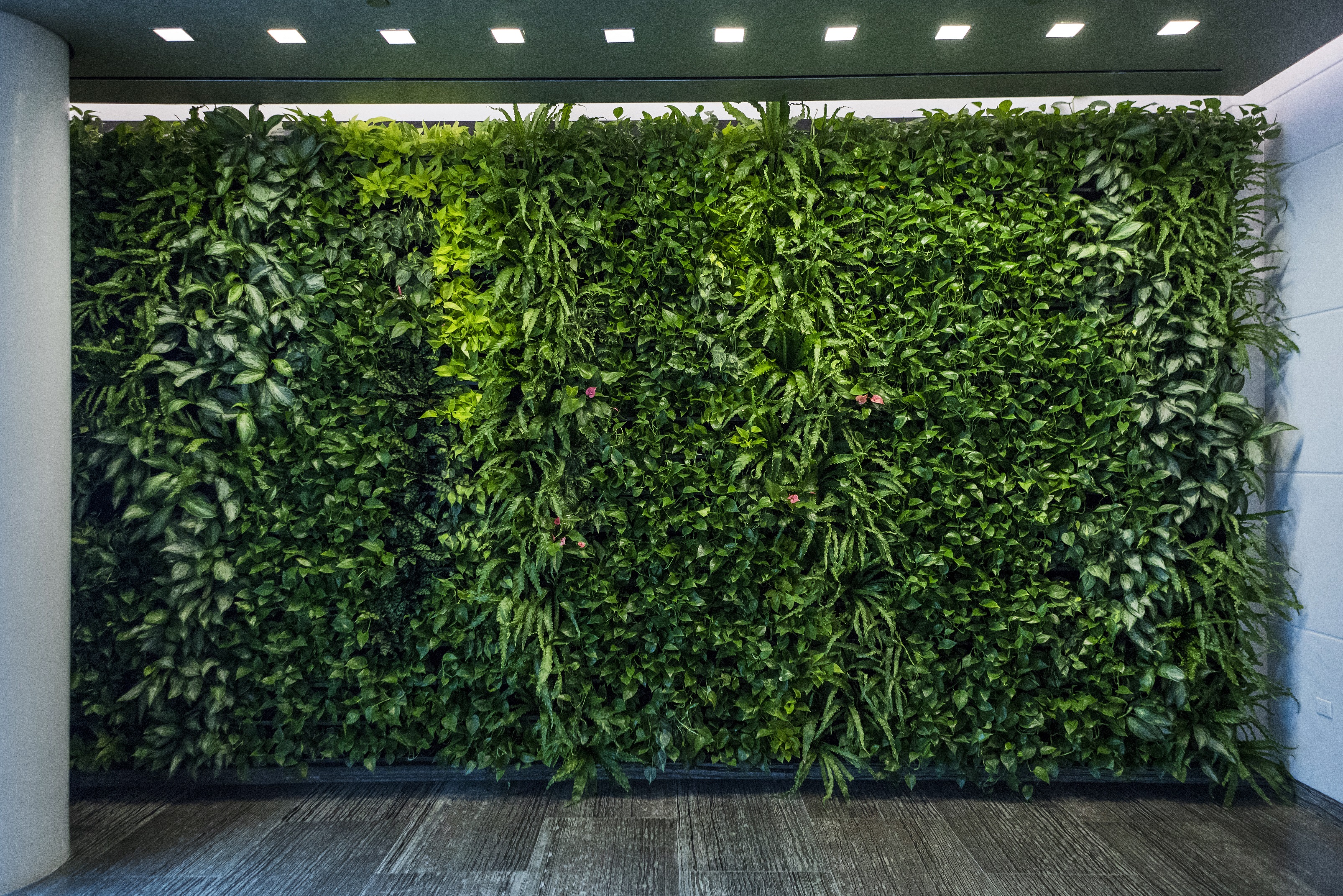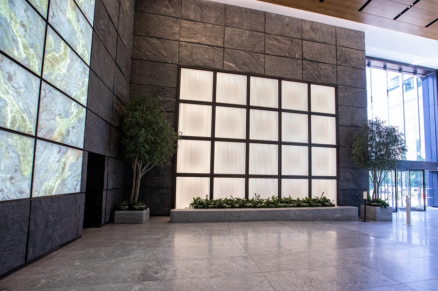 Preserved, replica trees 'breathe' life into this powerful lobby, anchored by live underplantings