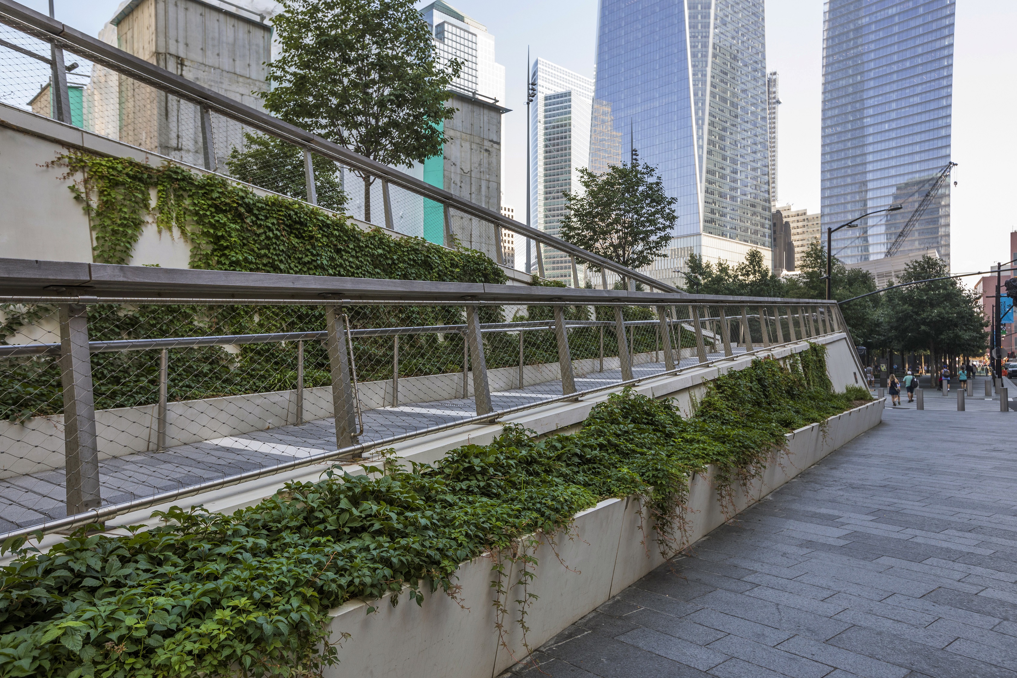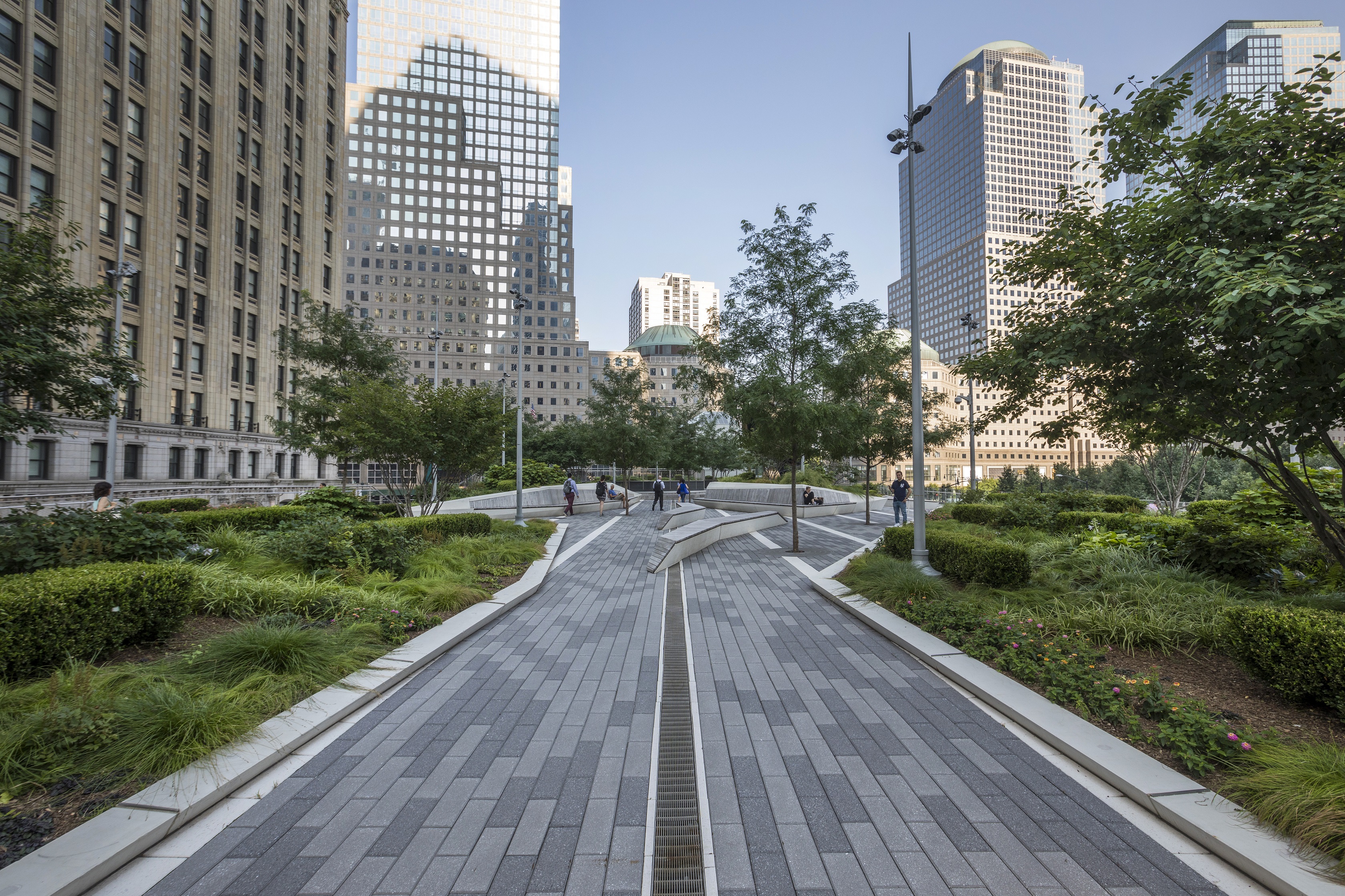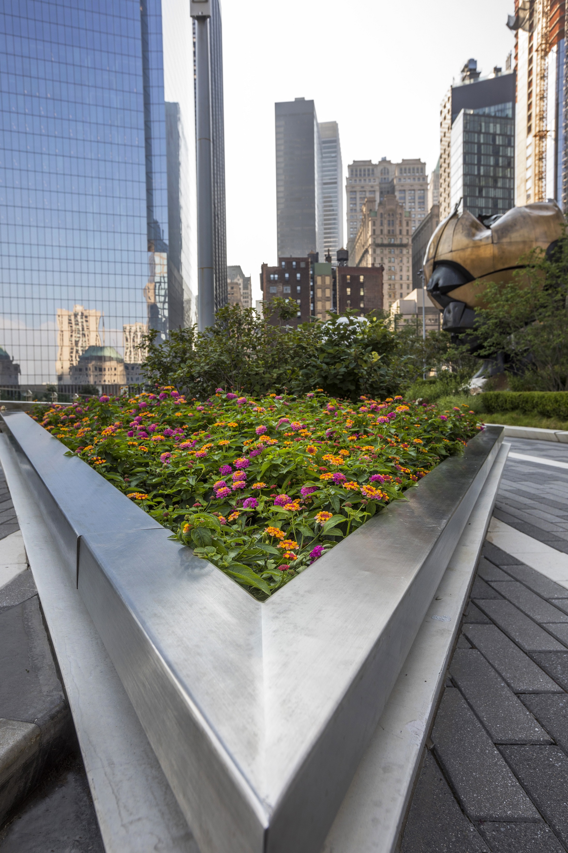 The sharp angles and clean lines cutting through this one-acre elevated park mirrors that of the freedom tower encouraging passersby to stop and reflect as they take in the surrounding views.