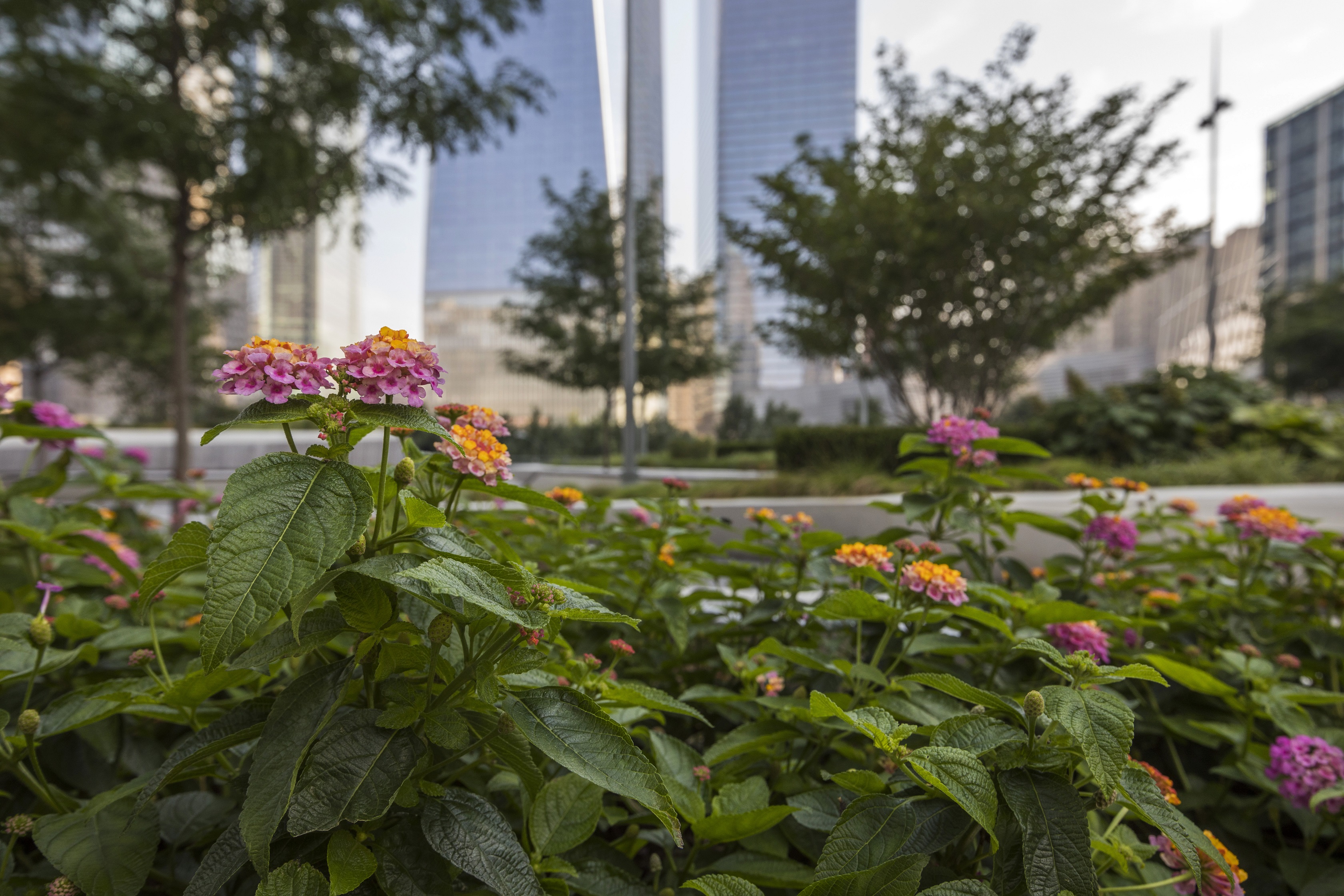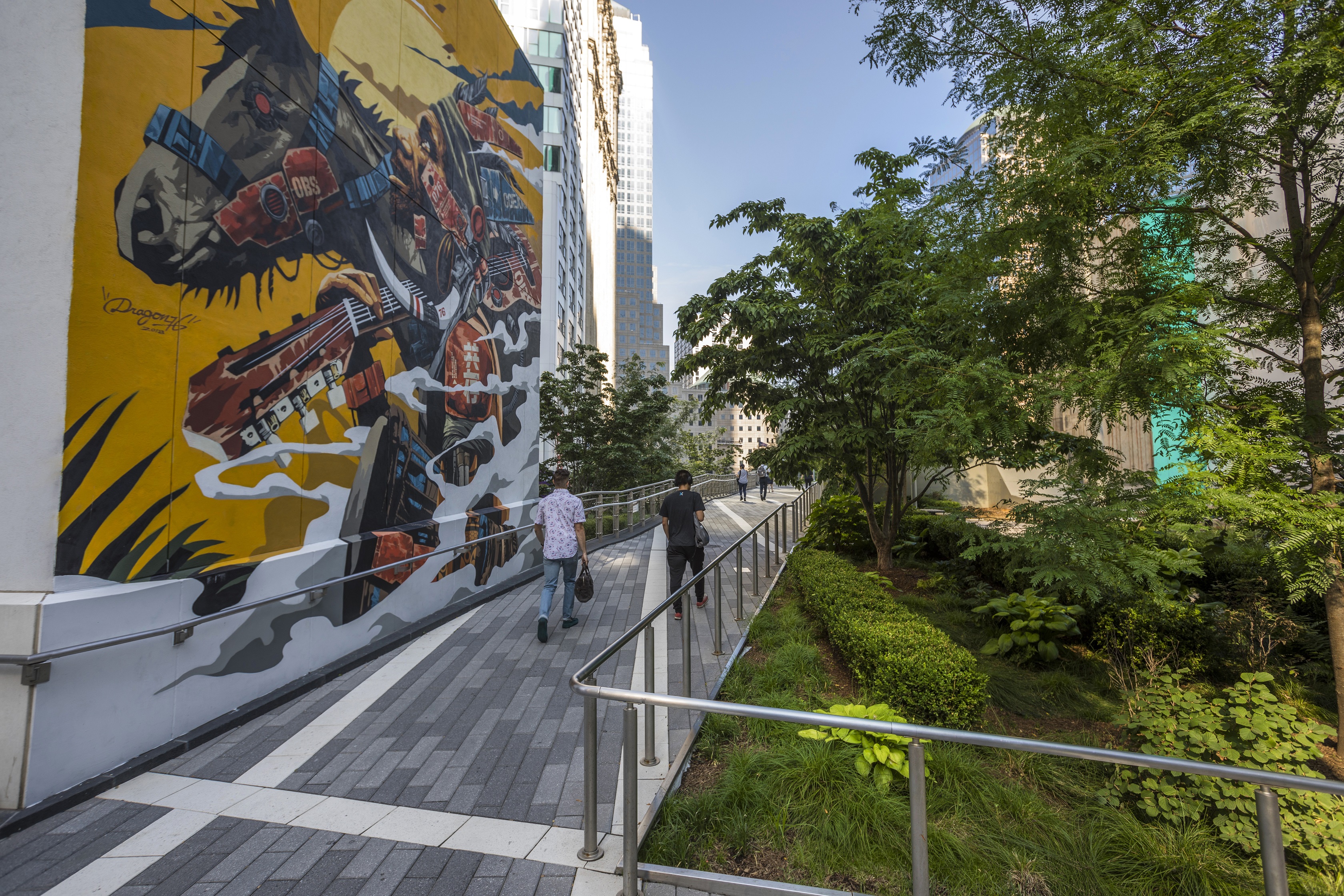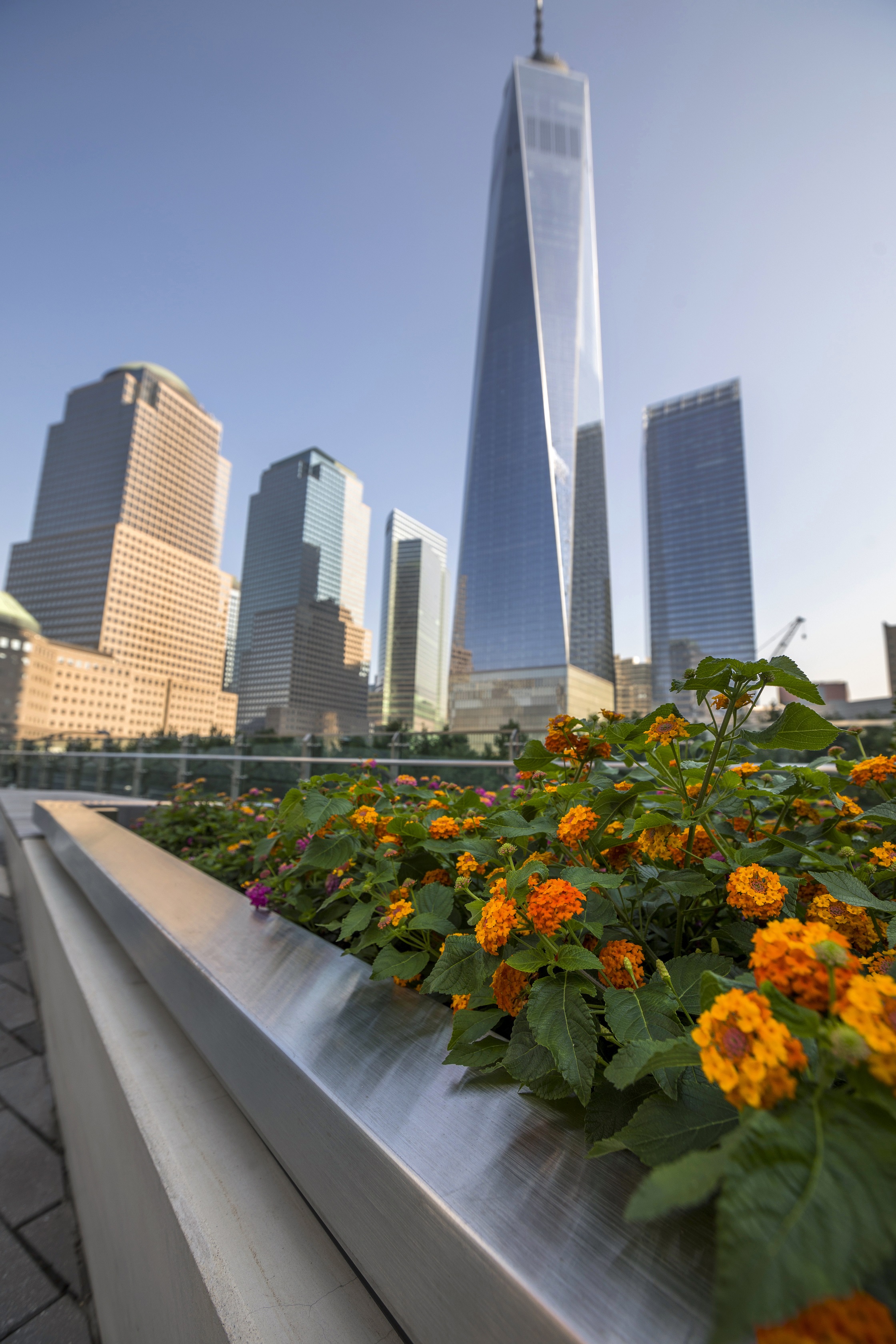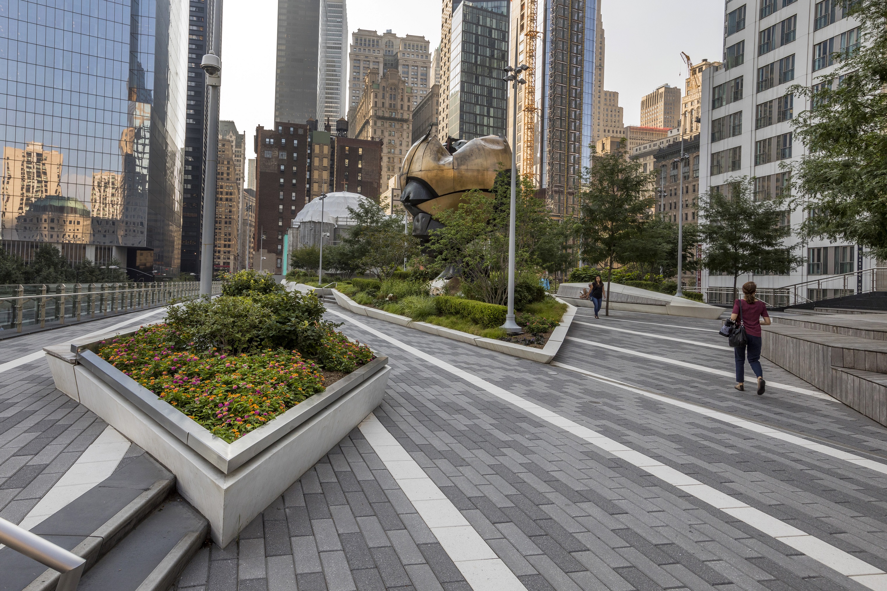 The sharp angles and clean lines cutting through this one-acre elevated park mirrors that of the freedom tower encouraging passersby to stop and reflect as they take in the surrounding views.