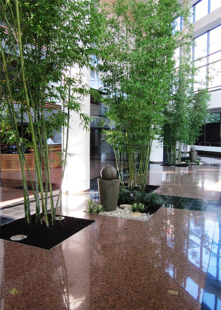 Perfectly maintained bamboo combined with water elements and gravel create a Zen atmosphere in this corporate lobby.