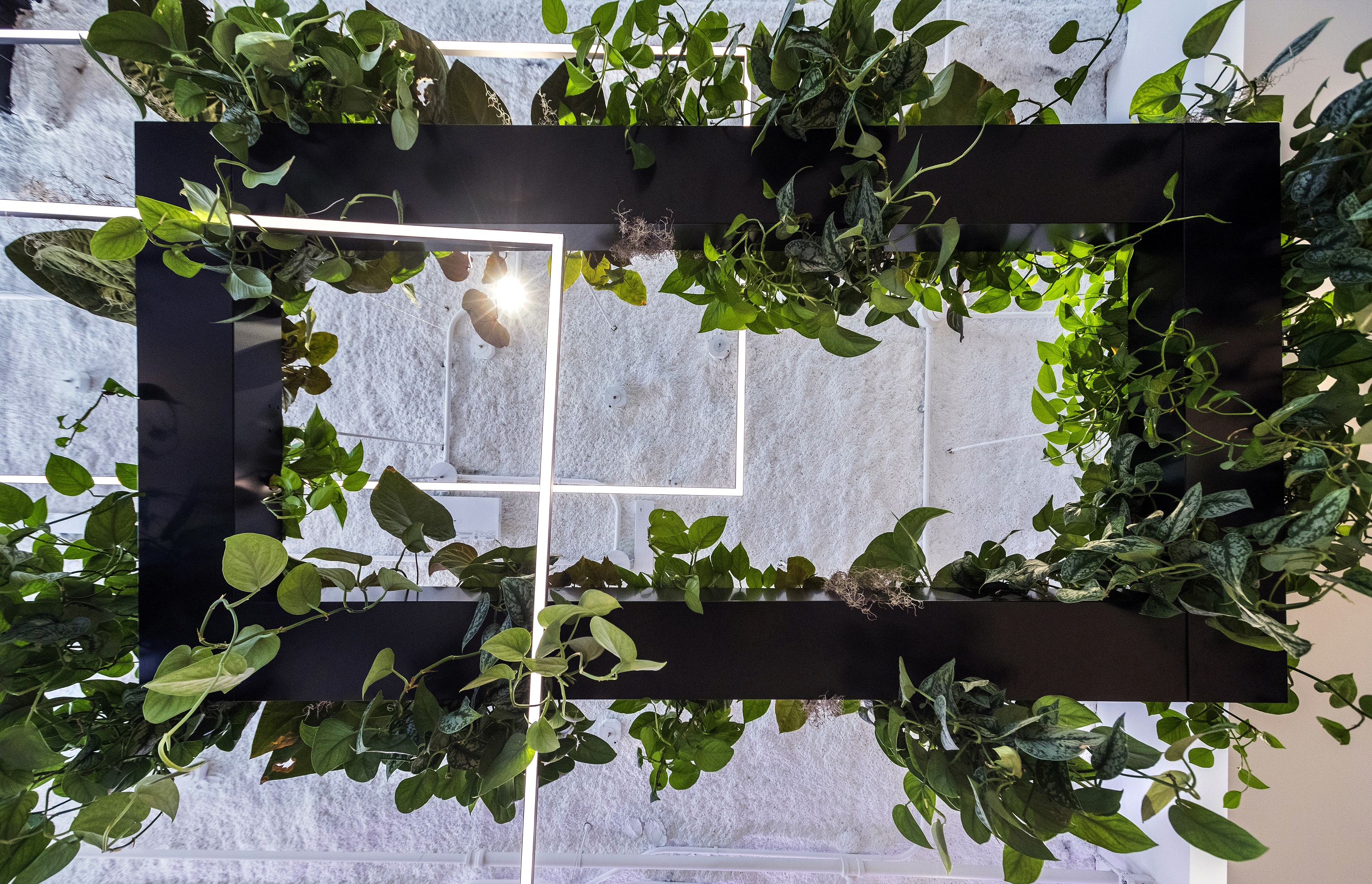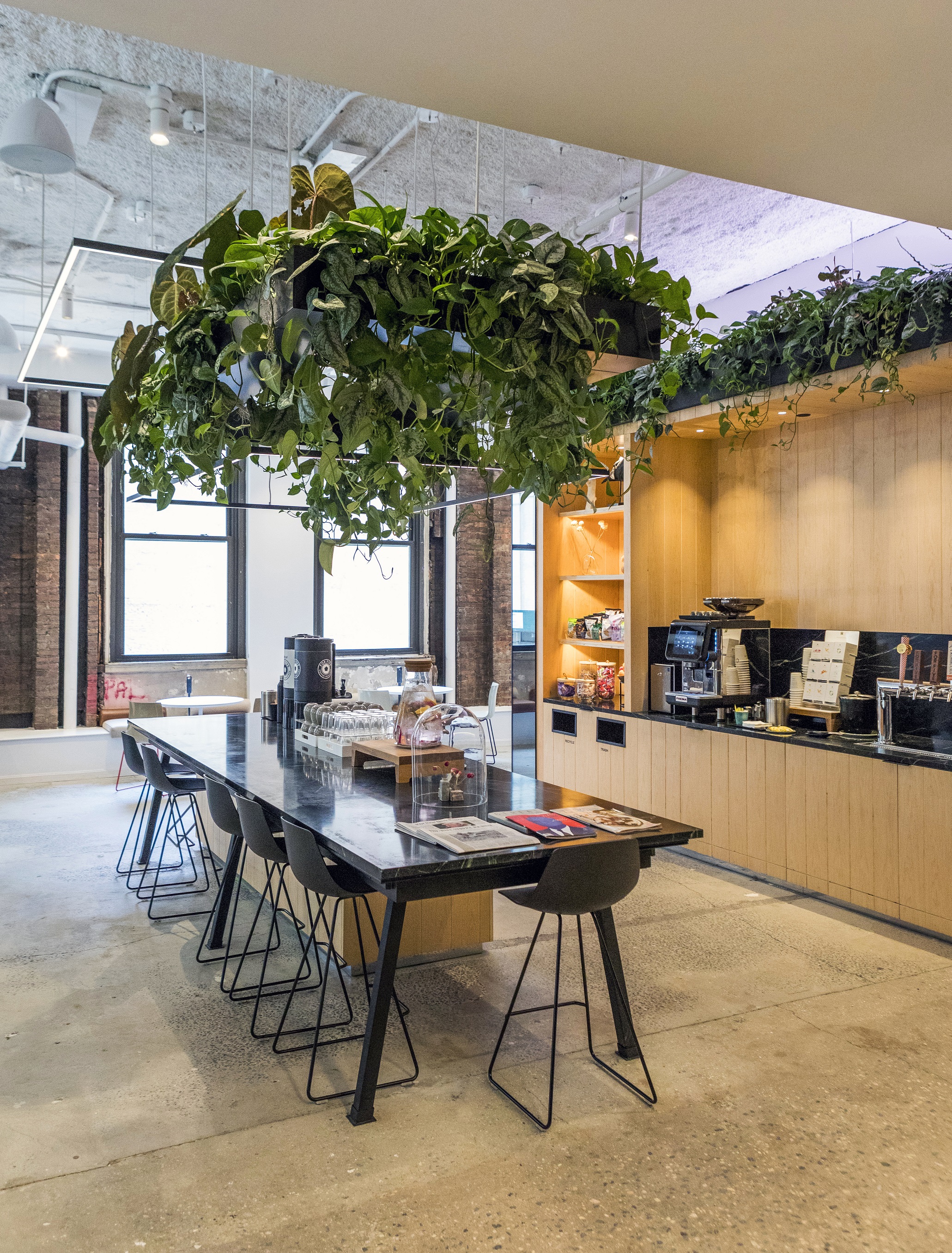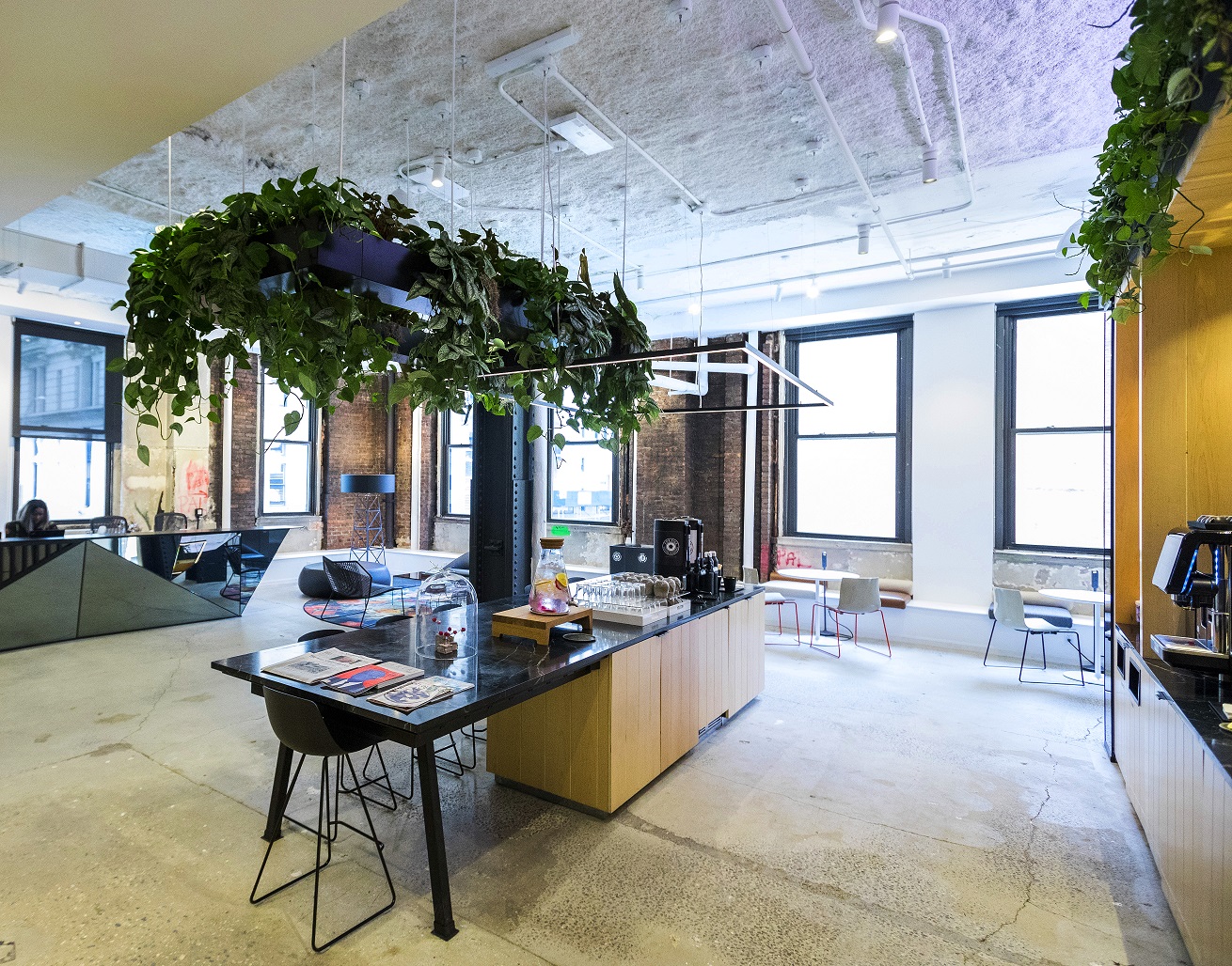 Suspended ceiling planters inspire fresh ideas in this collaborative environment.