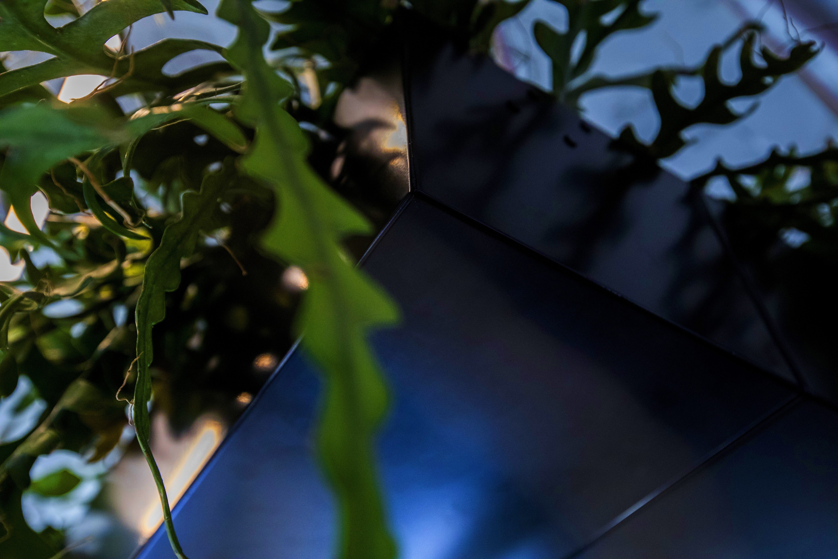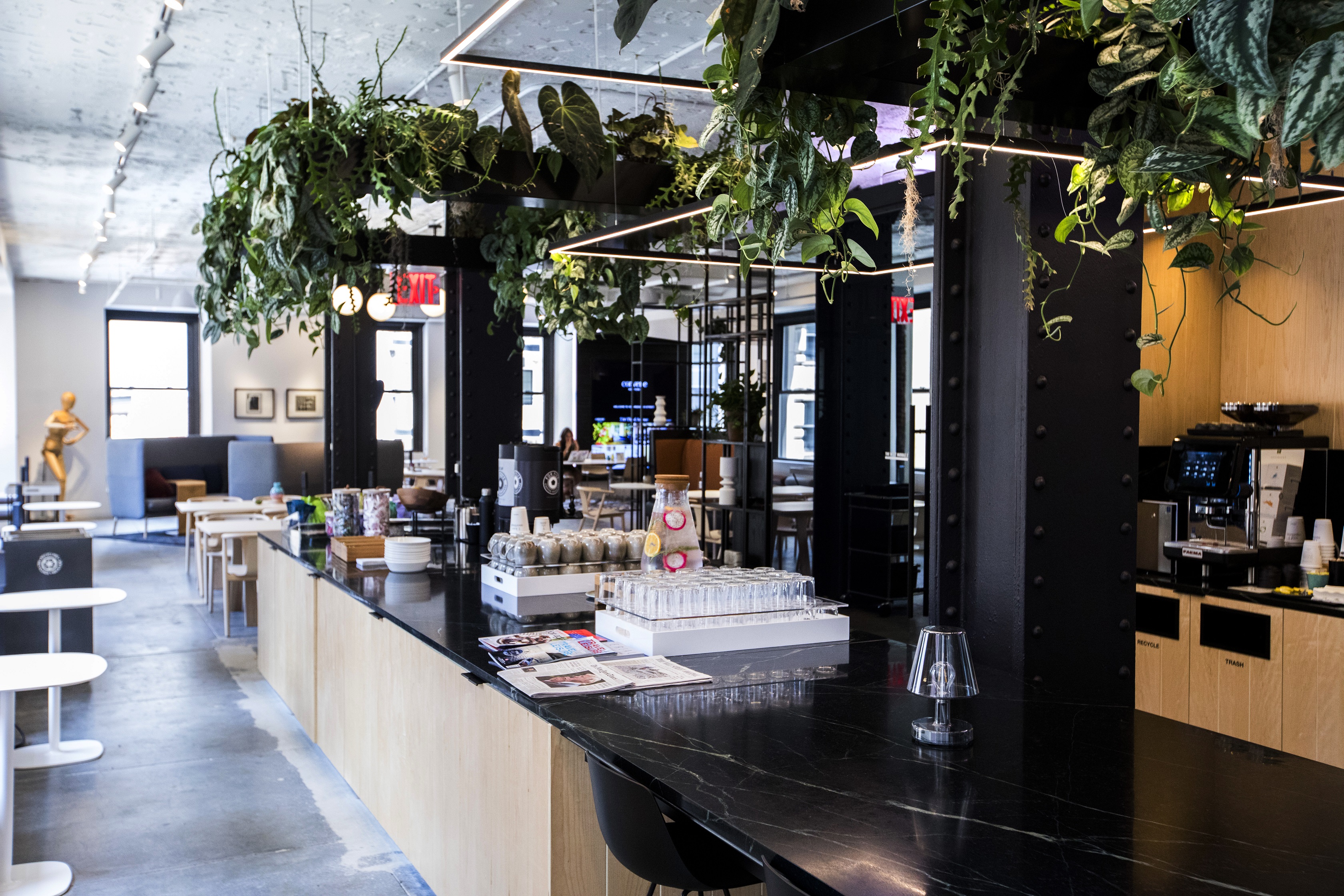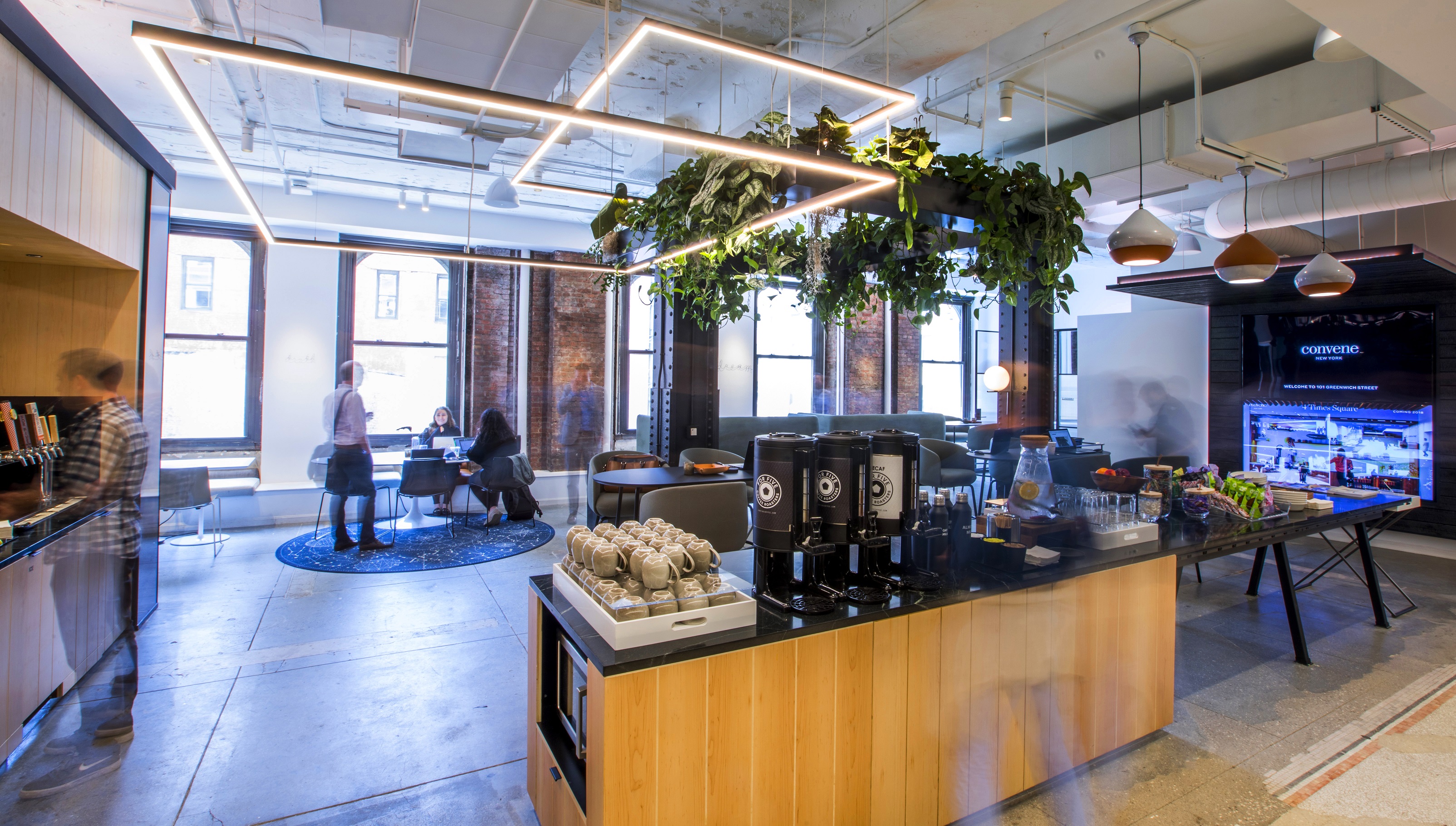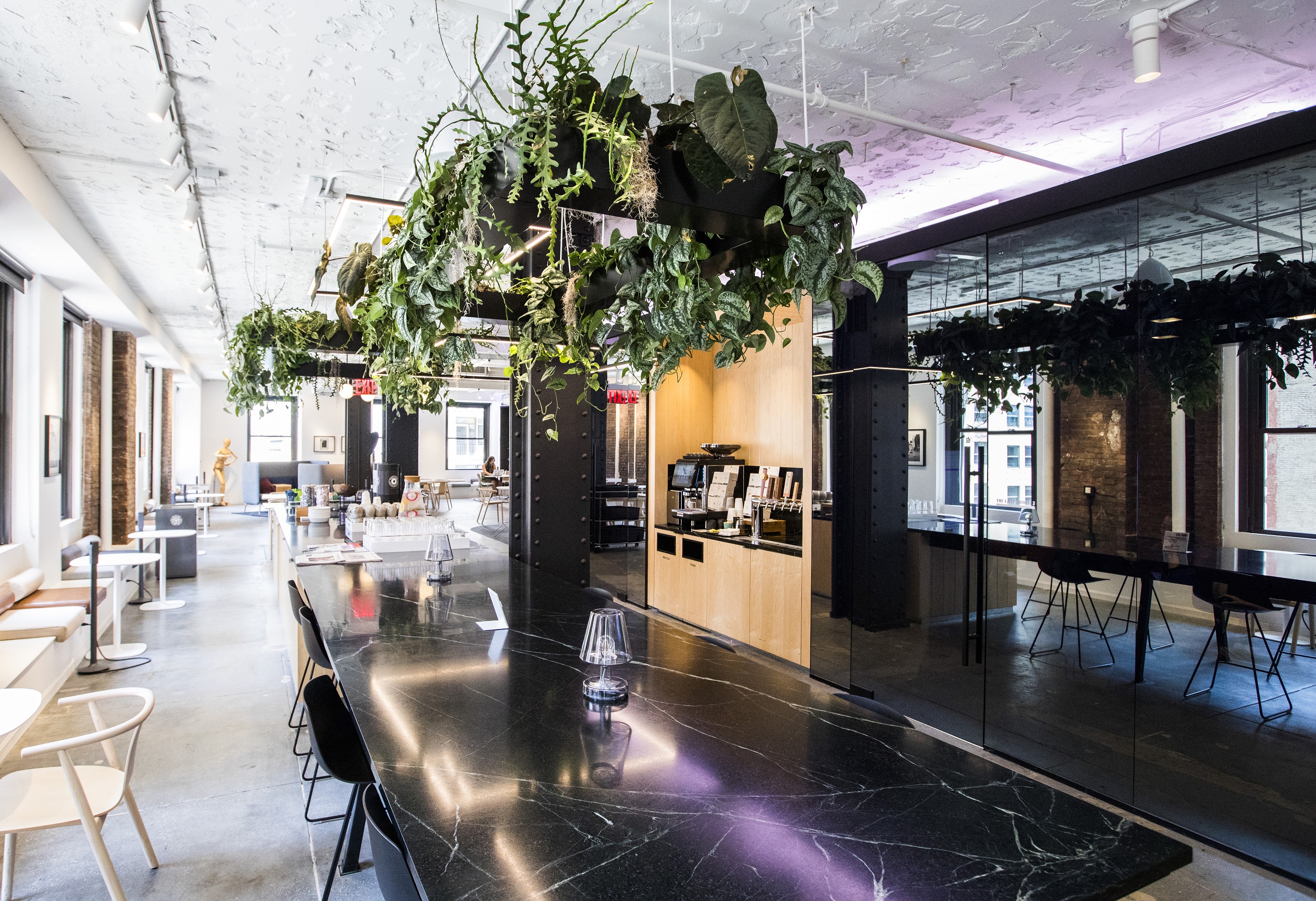 Suspended ceiling planters inspire fresh ideas in this collaborative environment.