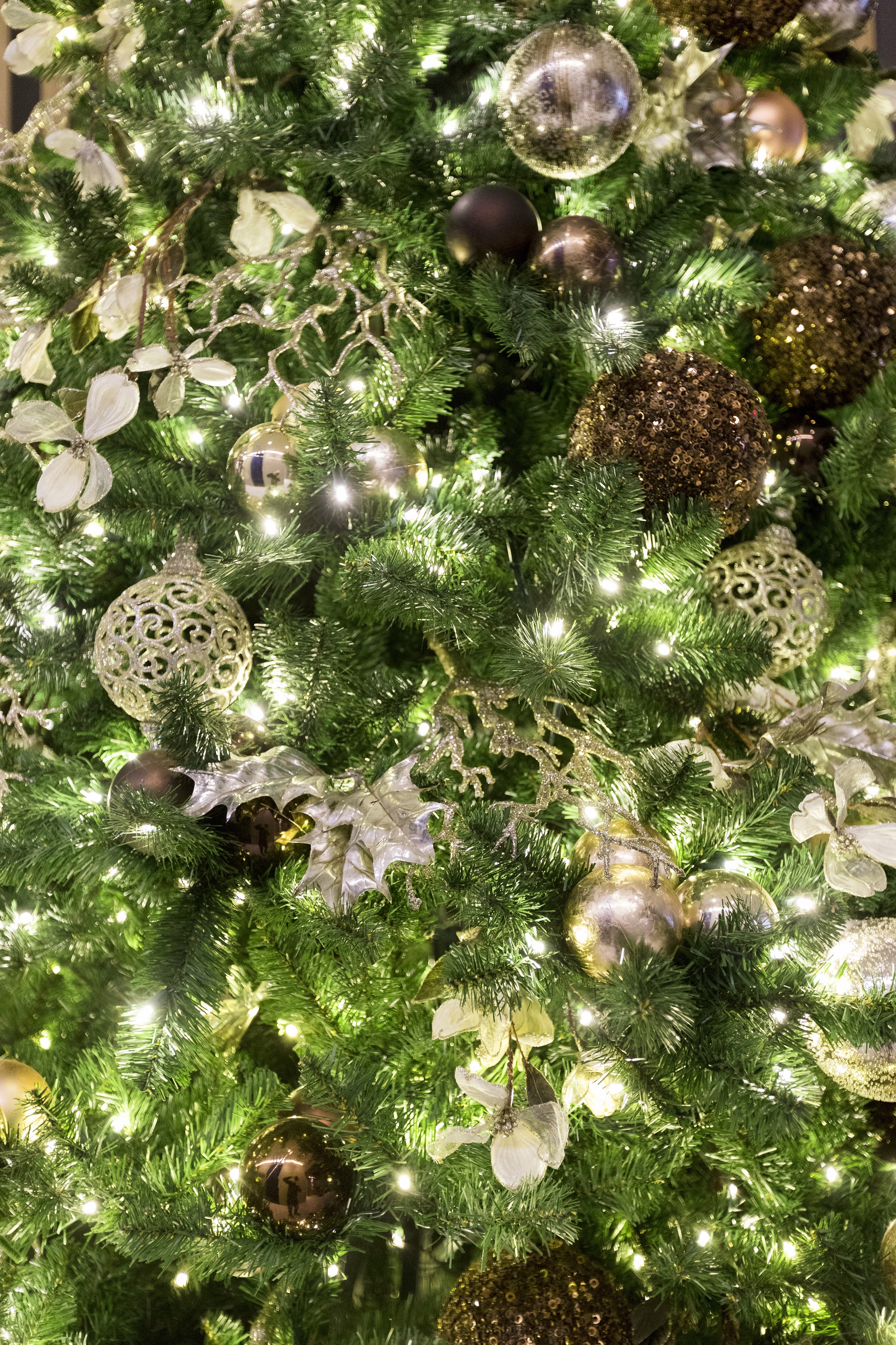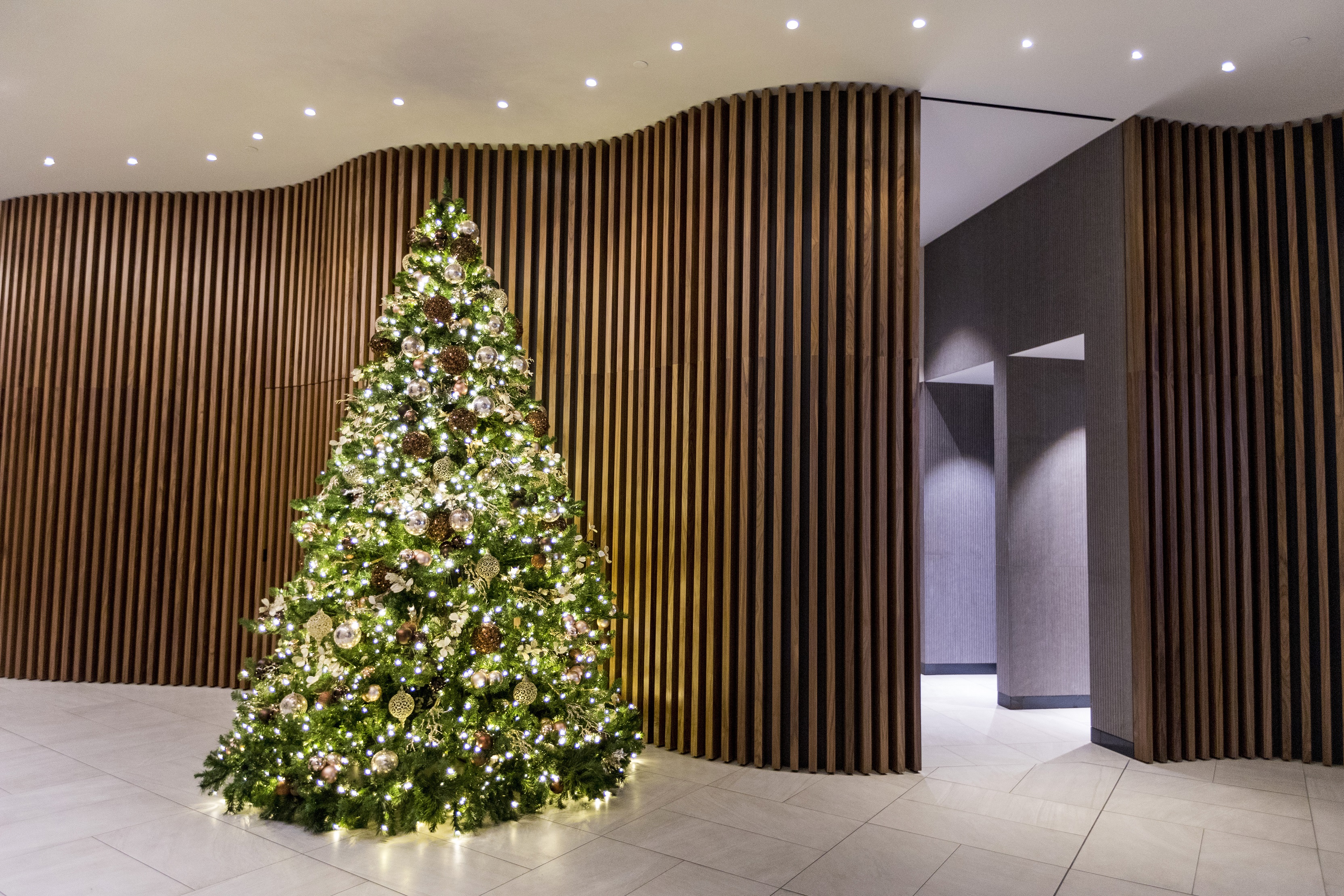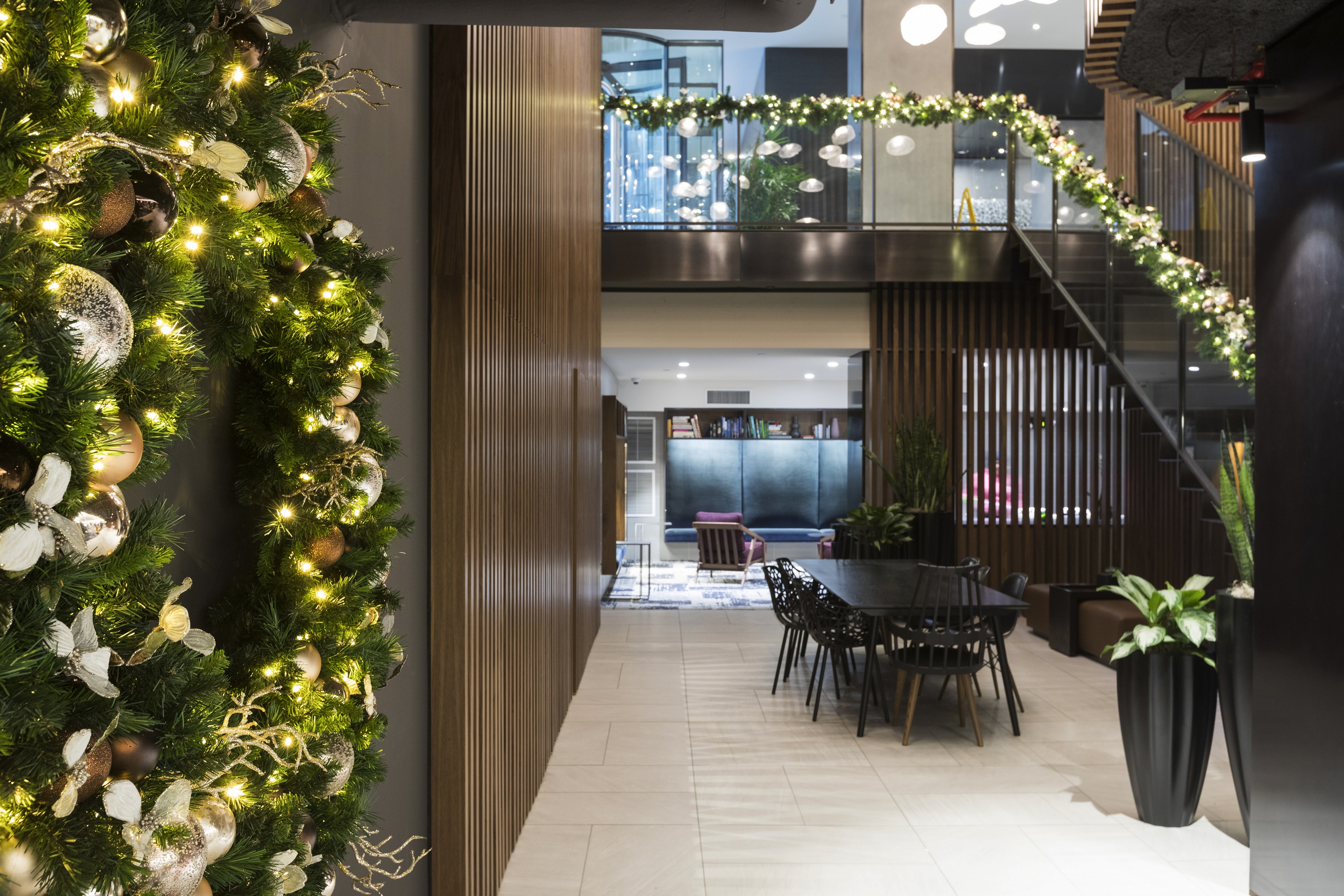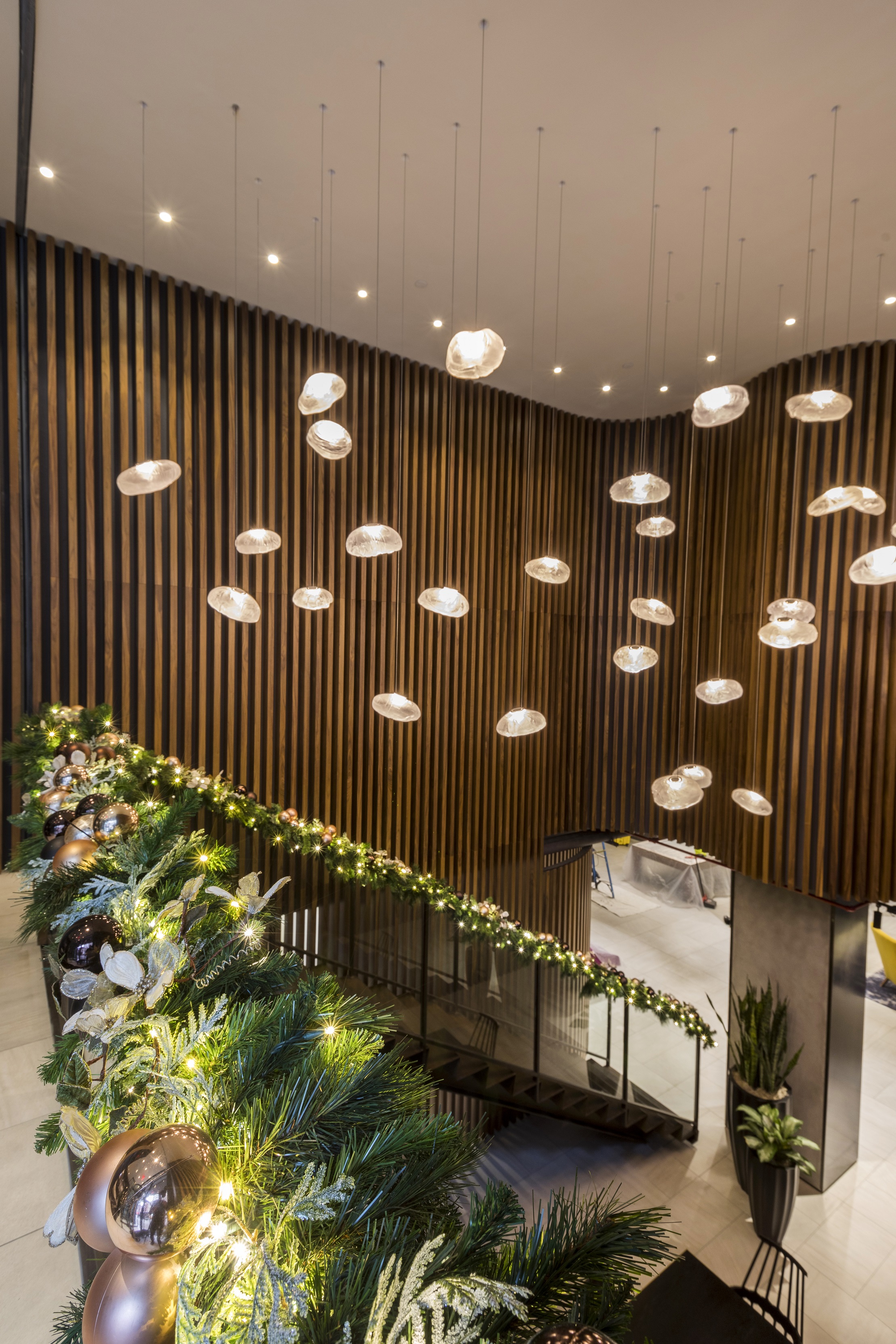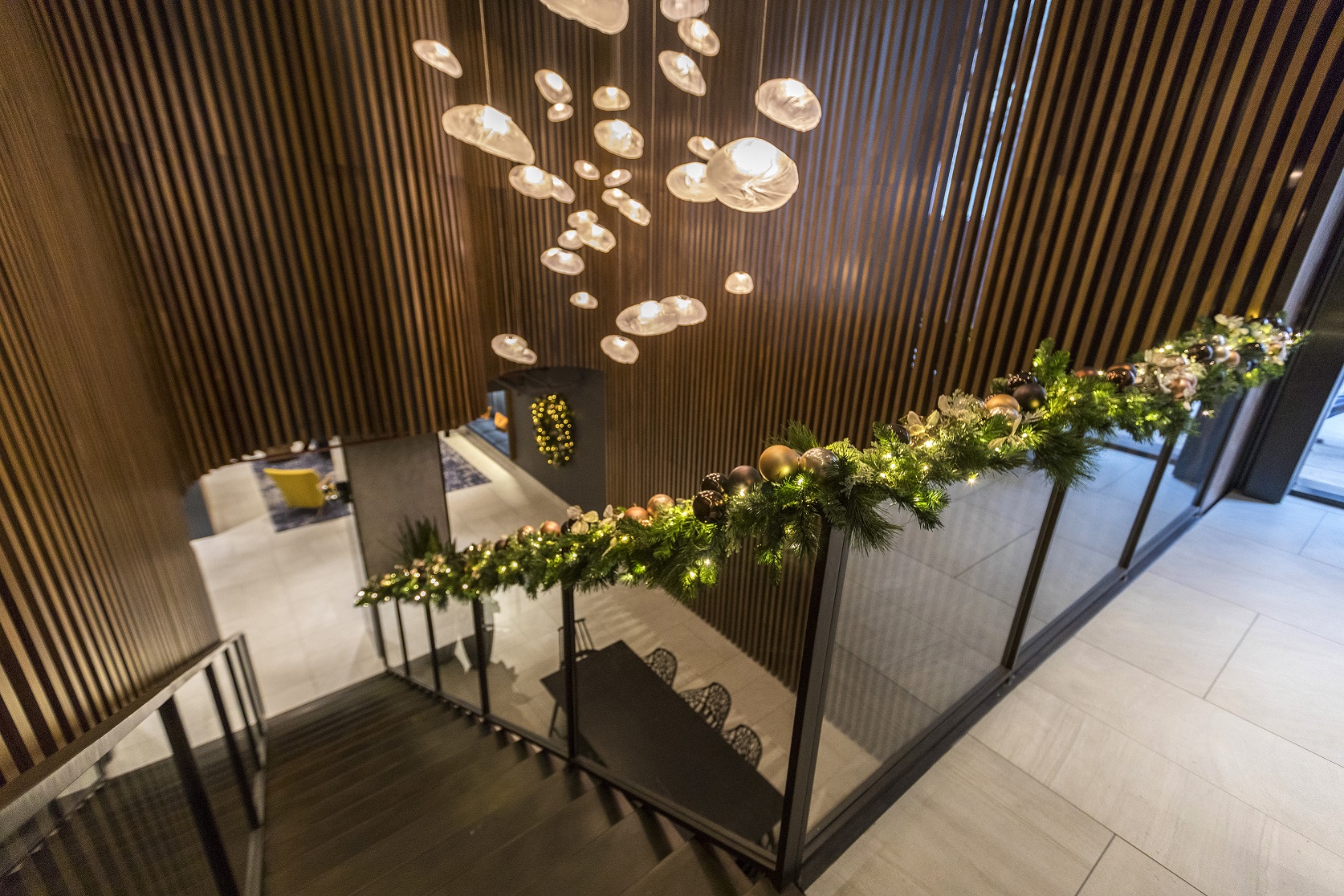 The warm wooden tones of this modern Manhattan lobby are echoed through naturalistic holiday elements. The garland wrapping up the staircase draws the eye up into the lofted ceiling filled with whimsical lights hovering above.