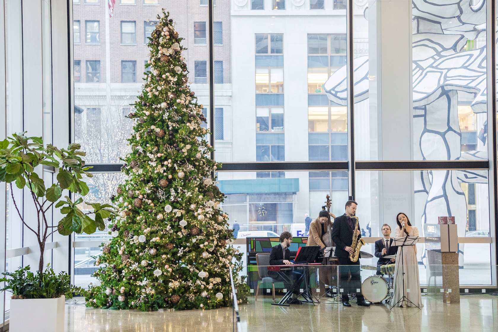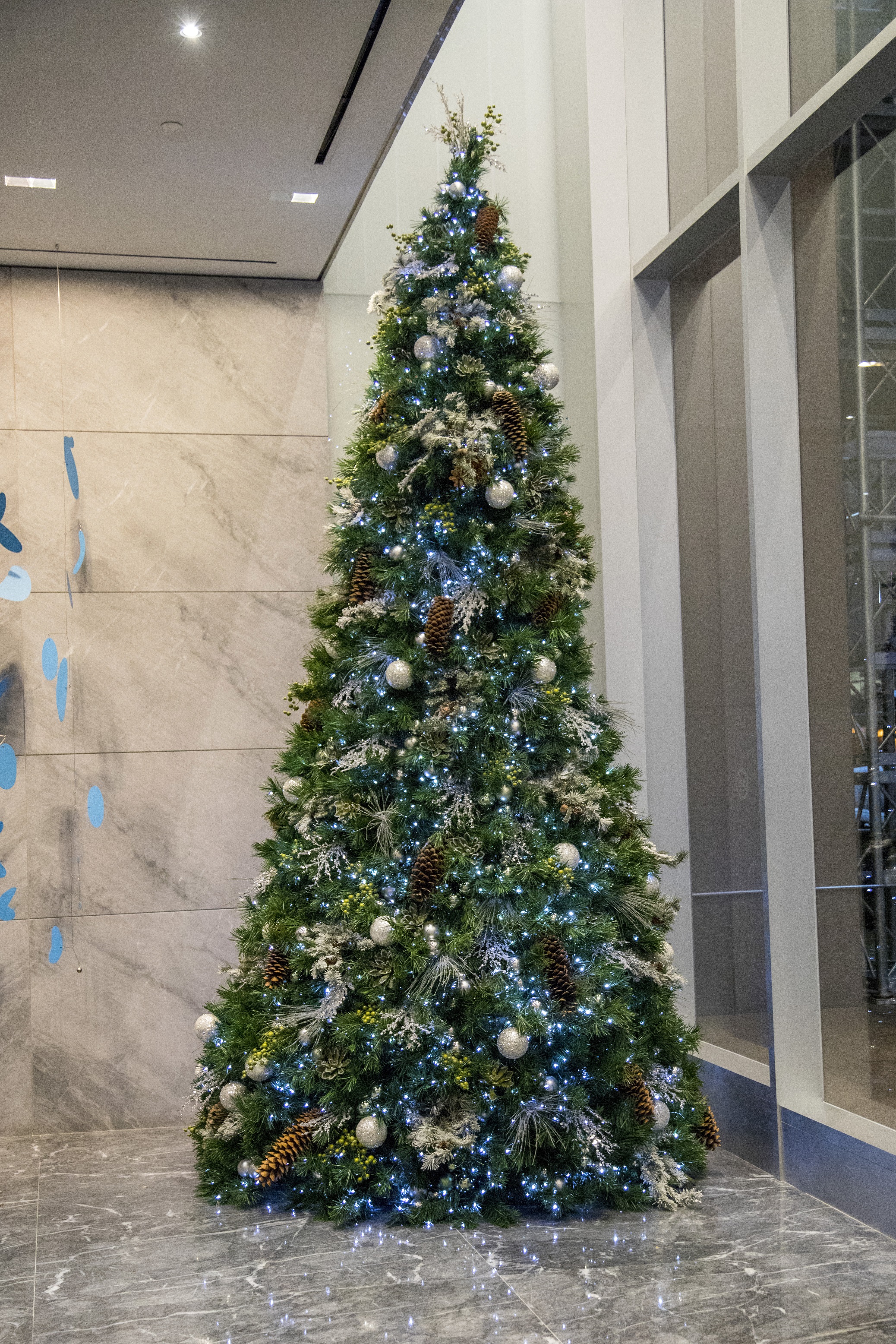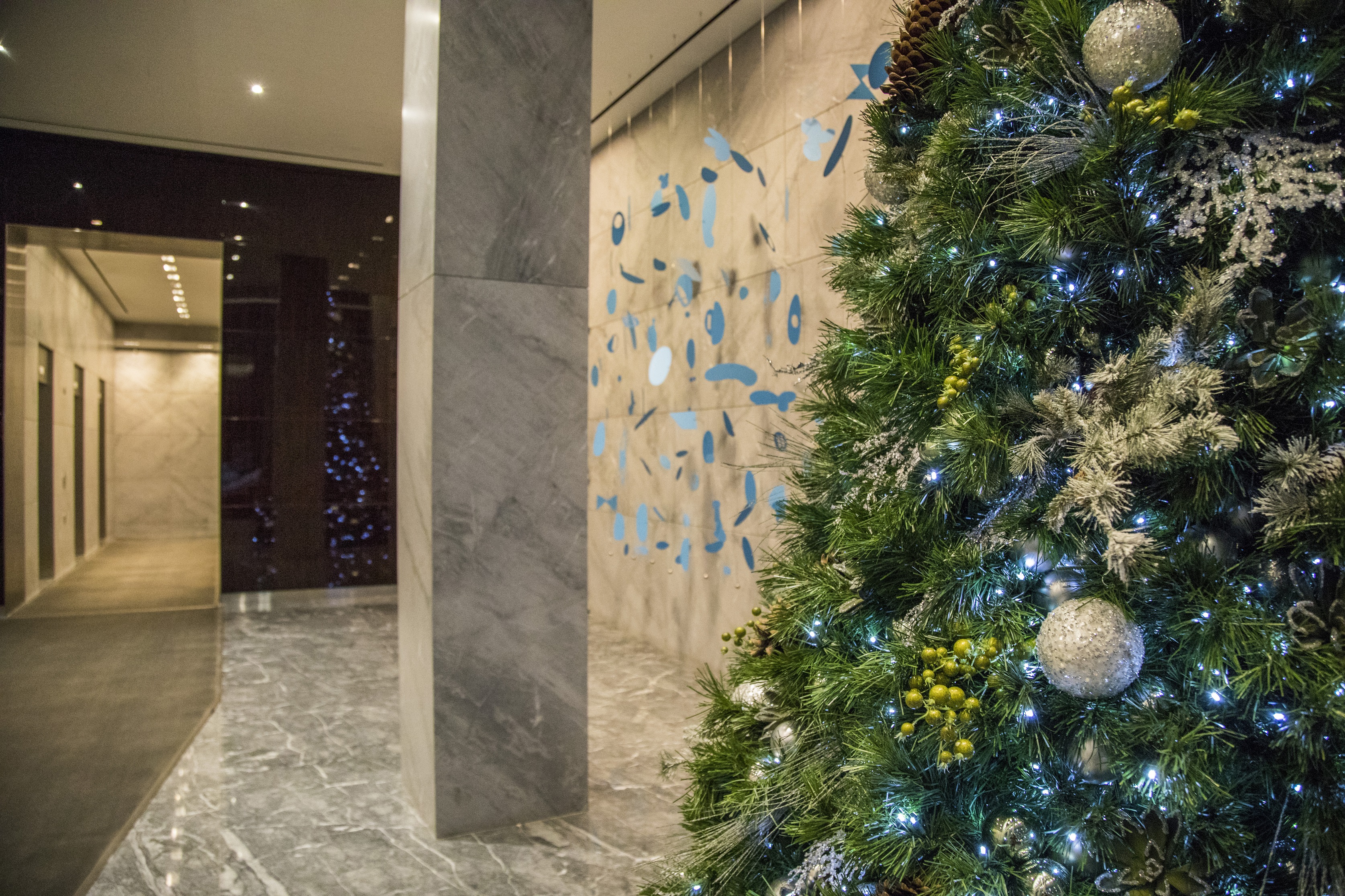 This striking design achieves impact with cool blue lighting, complimenting the modern art in the lobby.