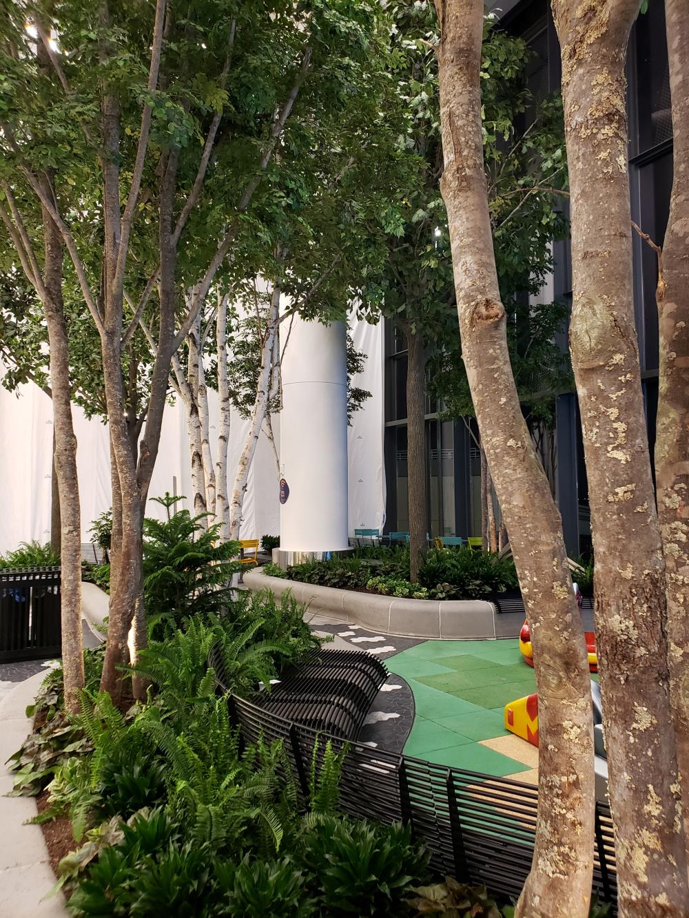 Although a skilled Landscape Architecture firm, Supermass Studios needed the help of our company to turn their outdoor New York understory into a lush composition that not only would thrive in the large medium light space but also would represent the ecosystem properly. This included adding towering 30’ artificial trees to encompass the full concept of a forest zone. In turn this complemented the floor tiles that mimicked light peeking through the top canopies and casting shadows to the spaces below.