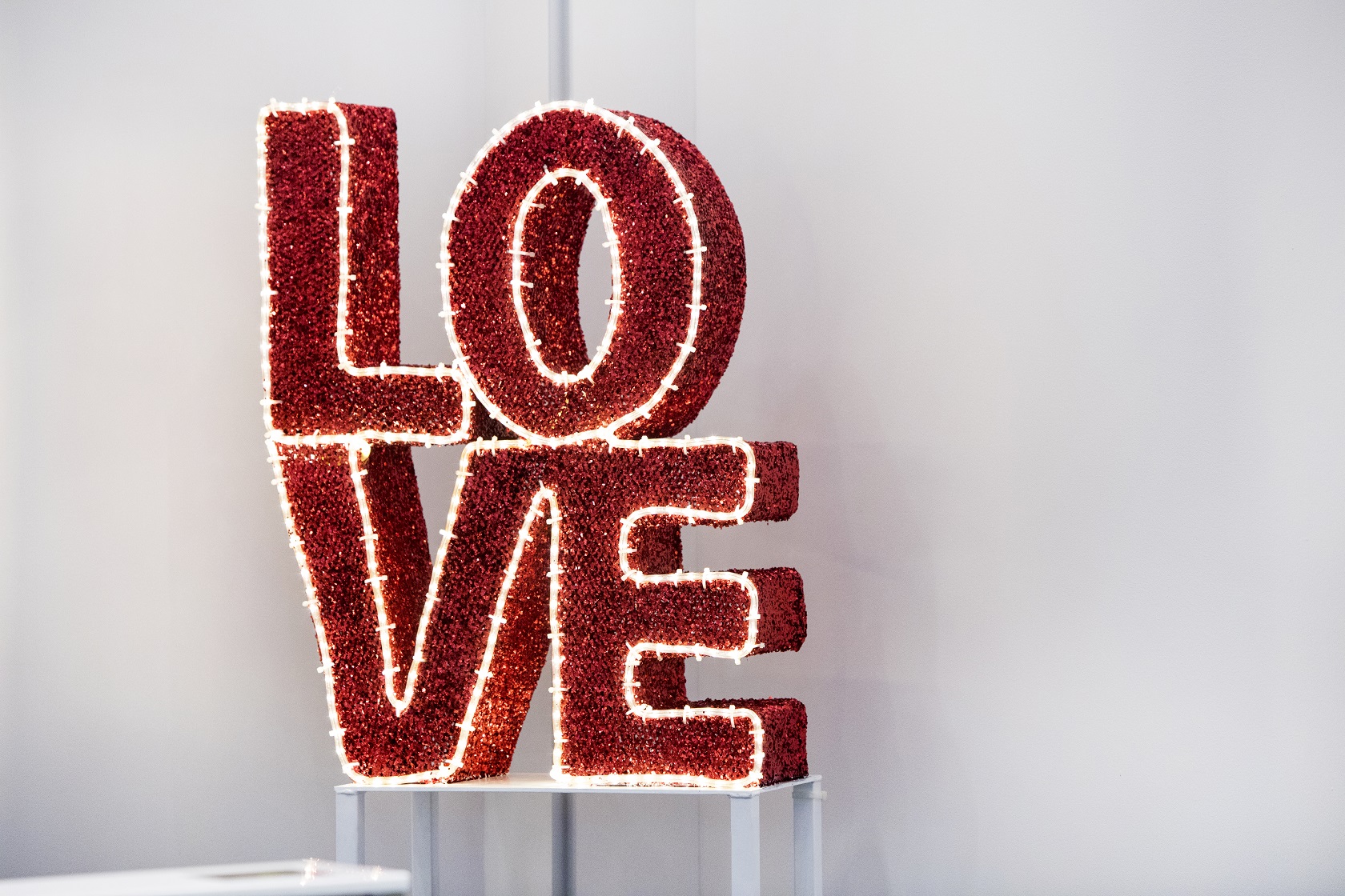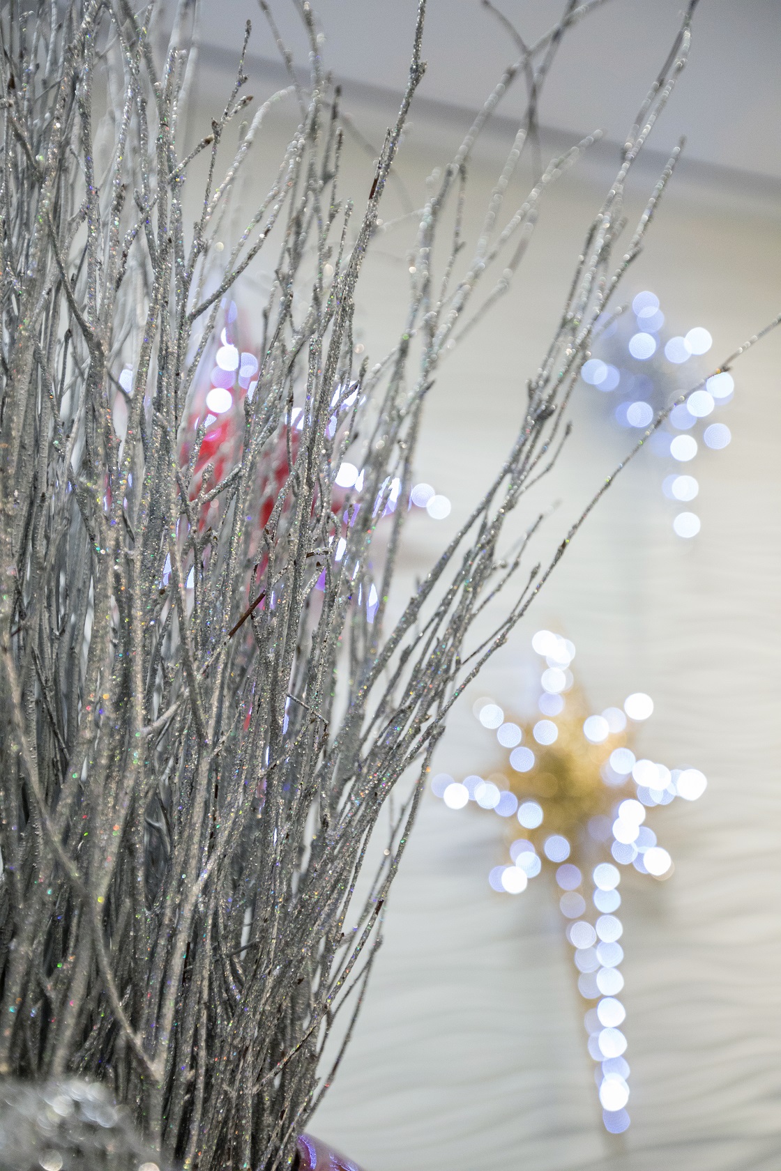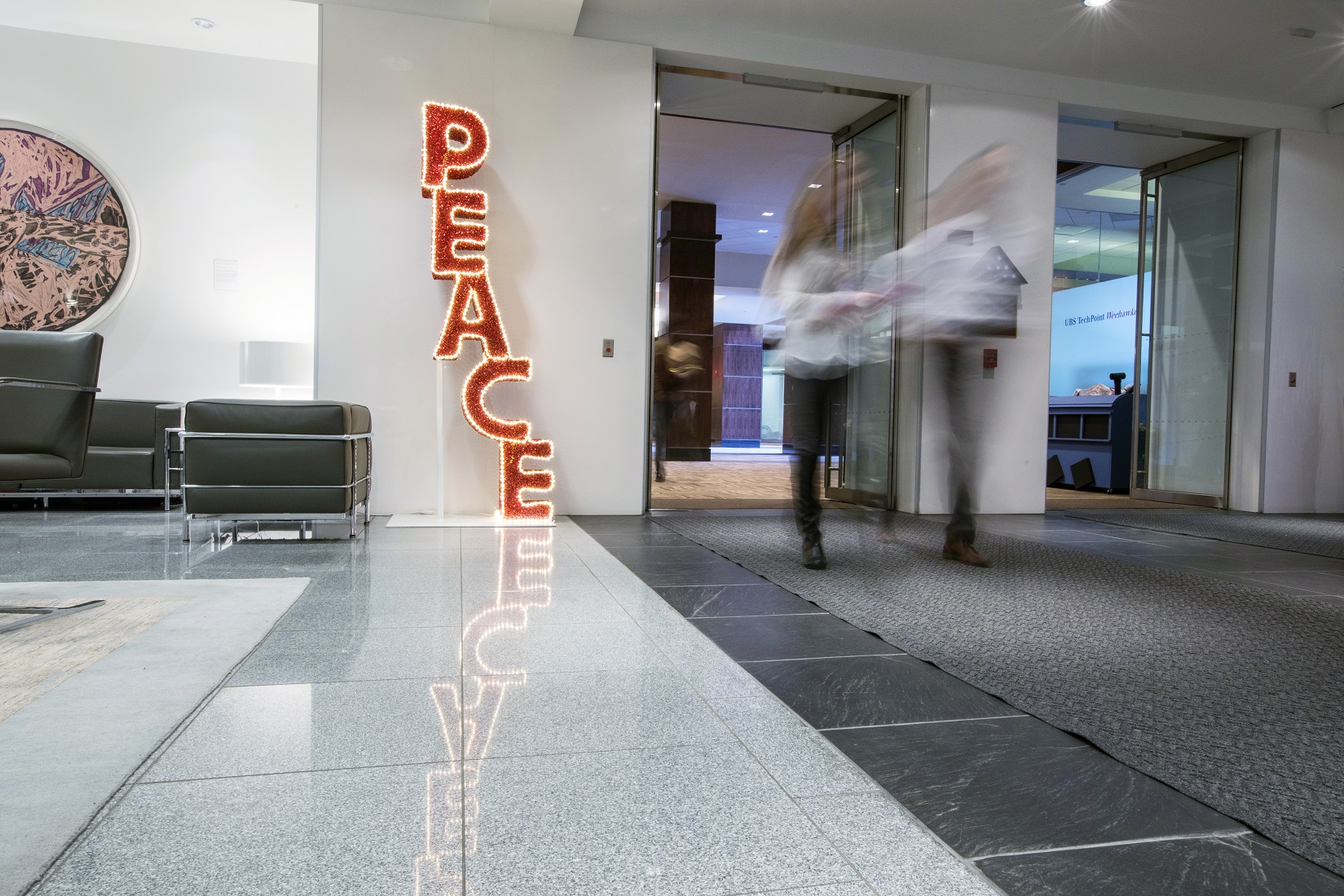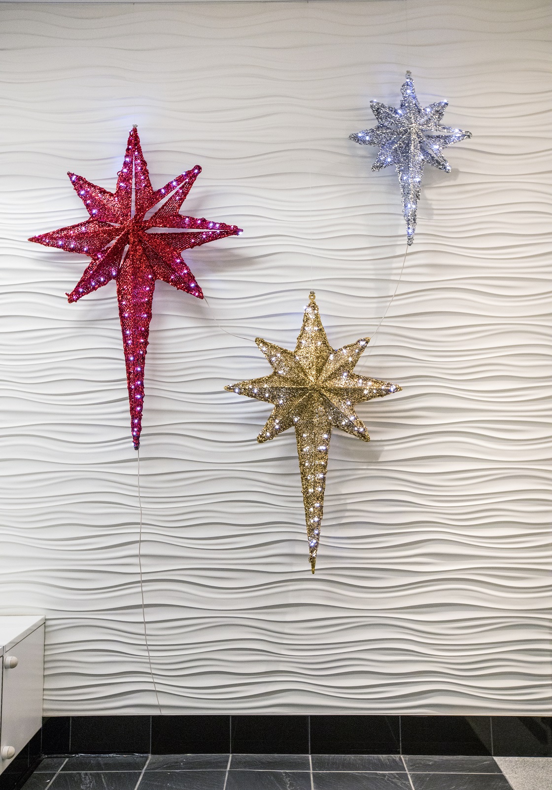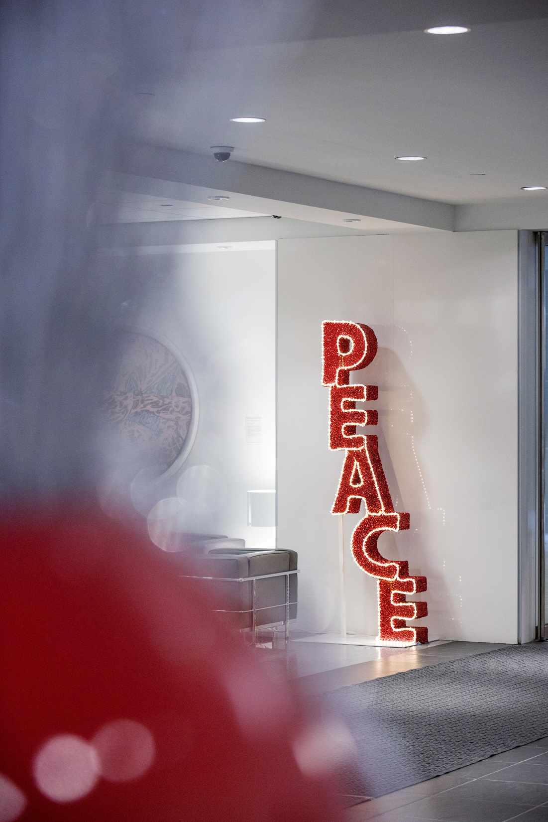 Creative sculptures and 3D letters come together to light up this contemporary lobby through the holiday season