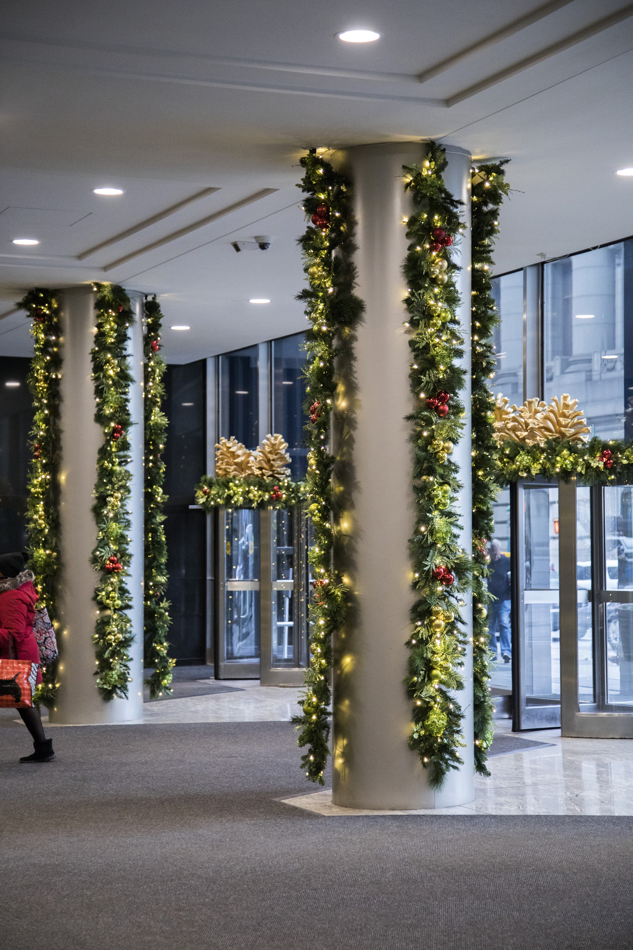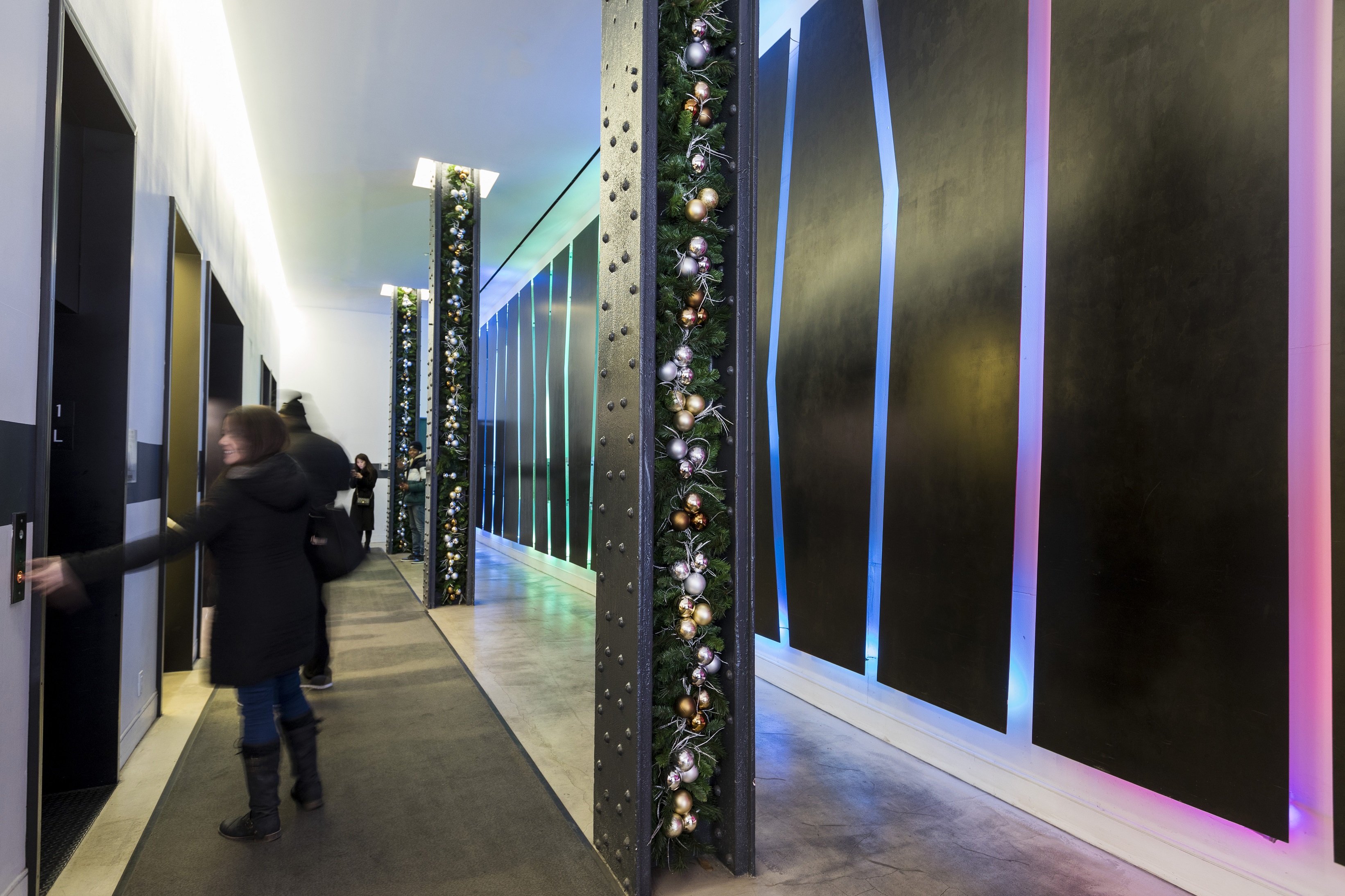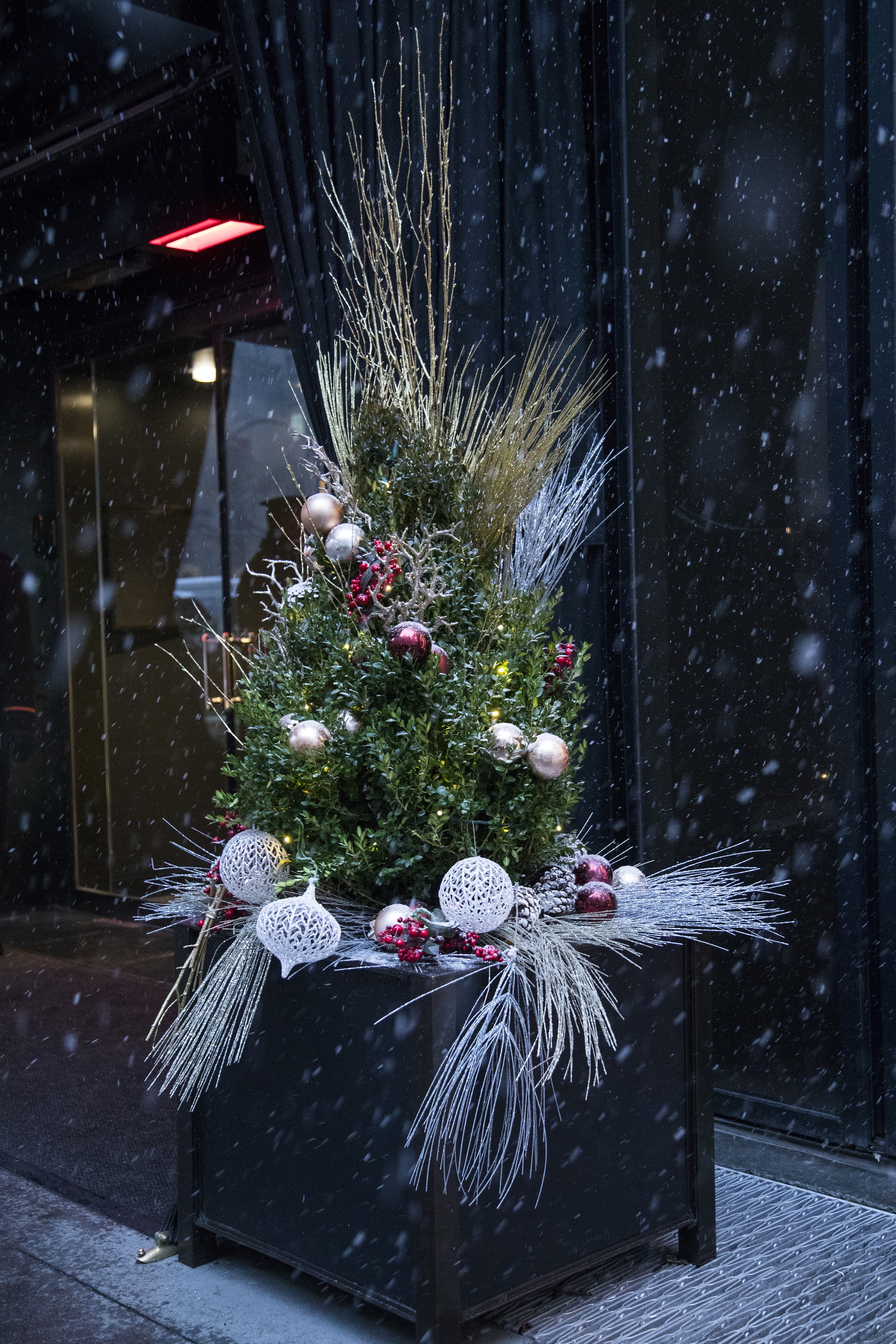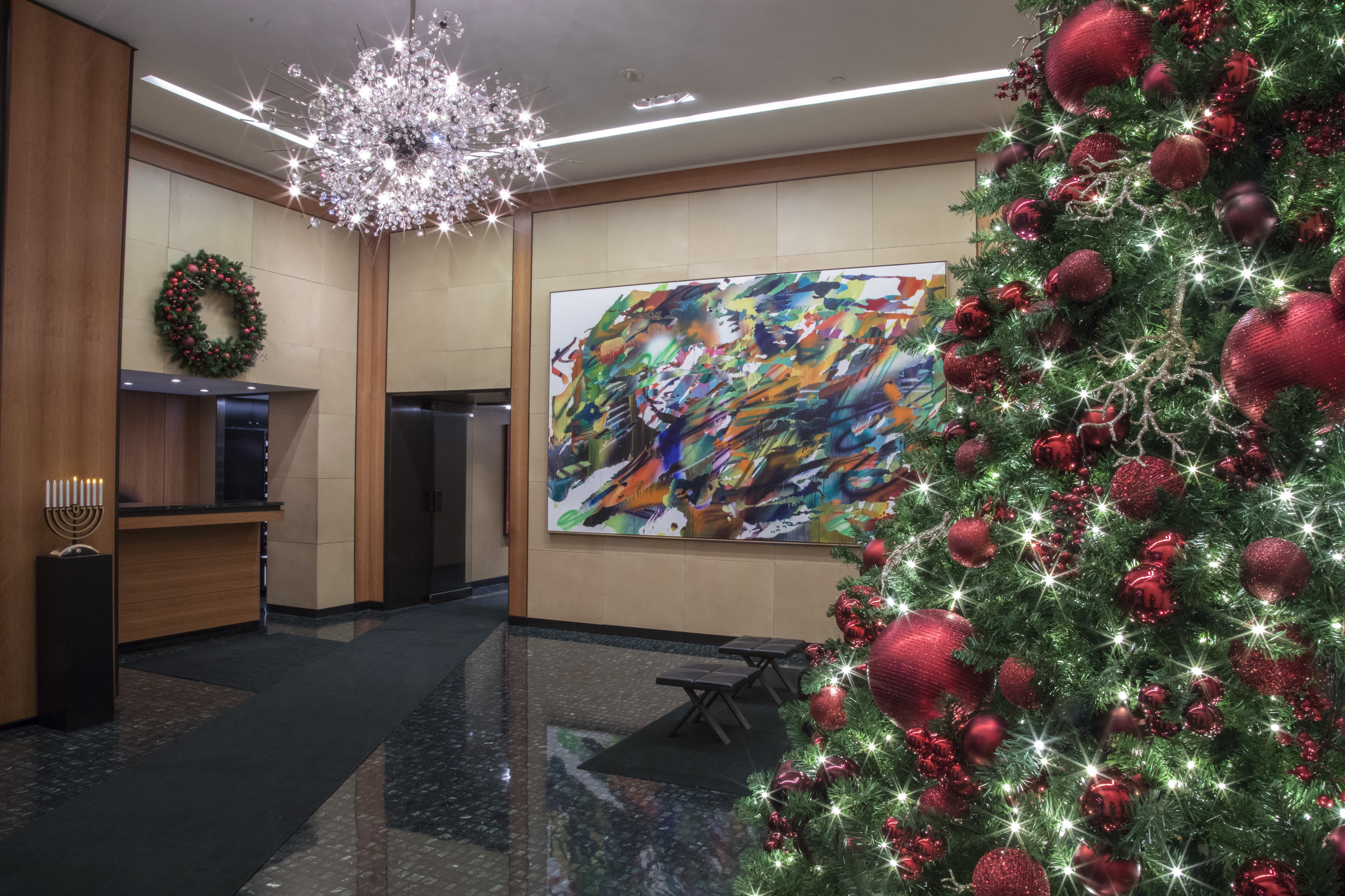 The coordination of refined components compliment the building’s ultra-lux decor, and make holiday an extension of the sophisticated aesthetic signature of the building. The design demonstrates the impact of discipline with design where an orchestrated cohesion occurs between seasonal celebration and existing fine art and finishes.