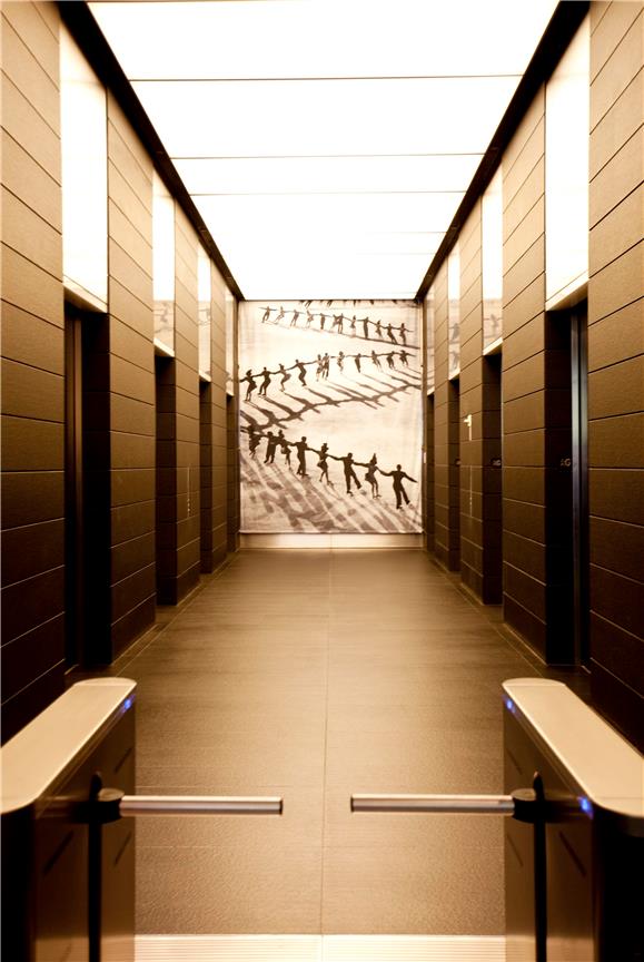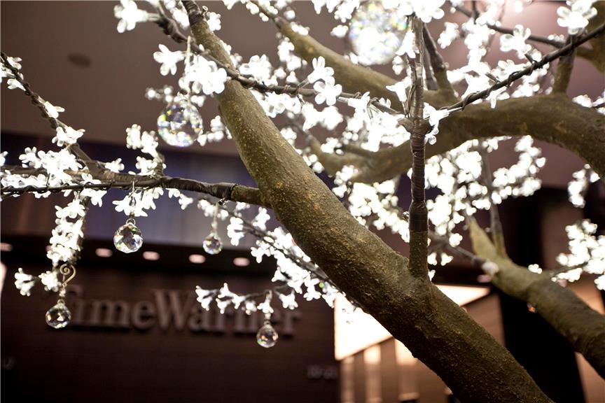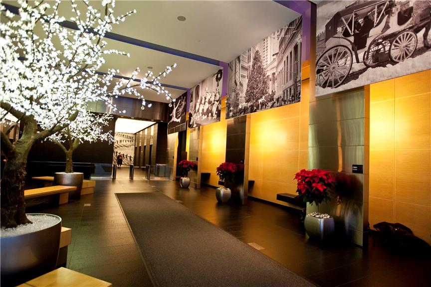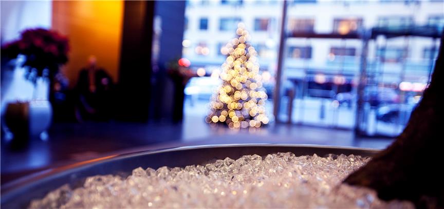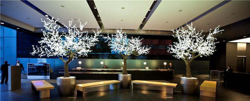 This contemporary lobby is transformed through the combination of chic modern décor and live holiday plantings