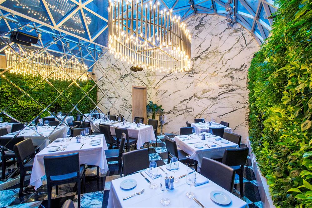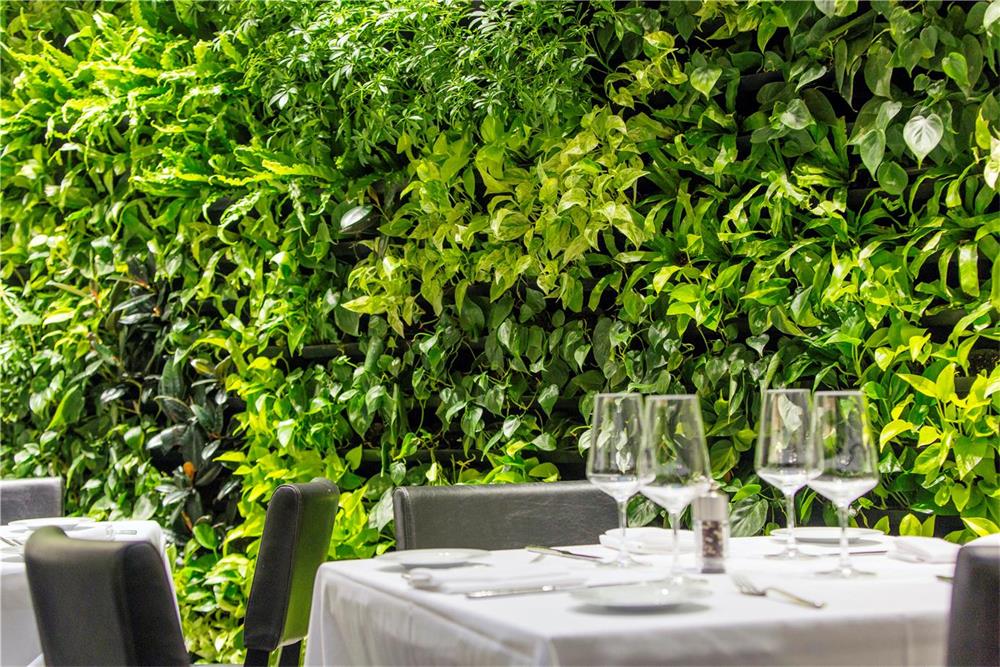 A wall to wall planting dampens the volume of the room and refreshes the air. In what may be a noisy and stuffy room, visitors find themselves at a quiet table with a smell reminiscent of the morning after a rain.