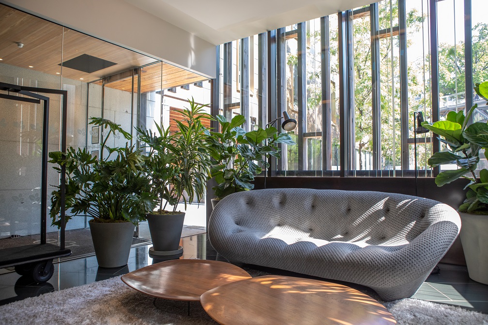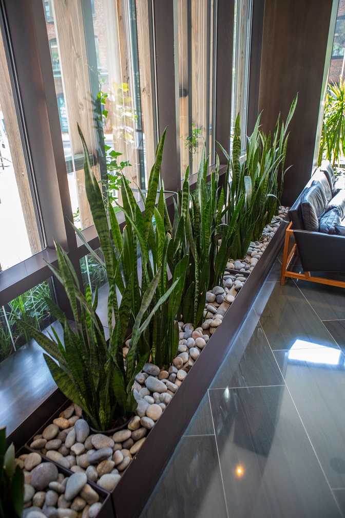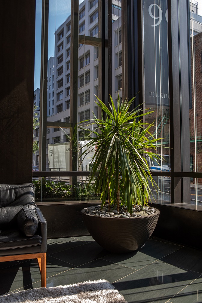 Large flourishing plants provide a strong sense of place for the residents of this Brooklyn condominium.