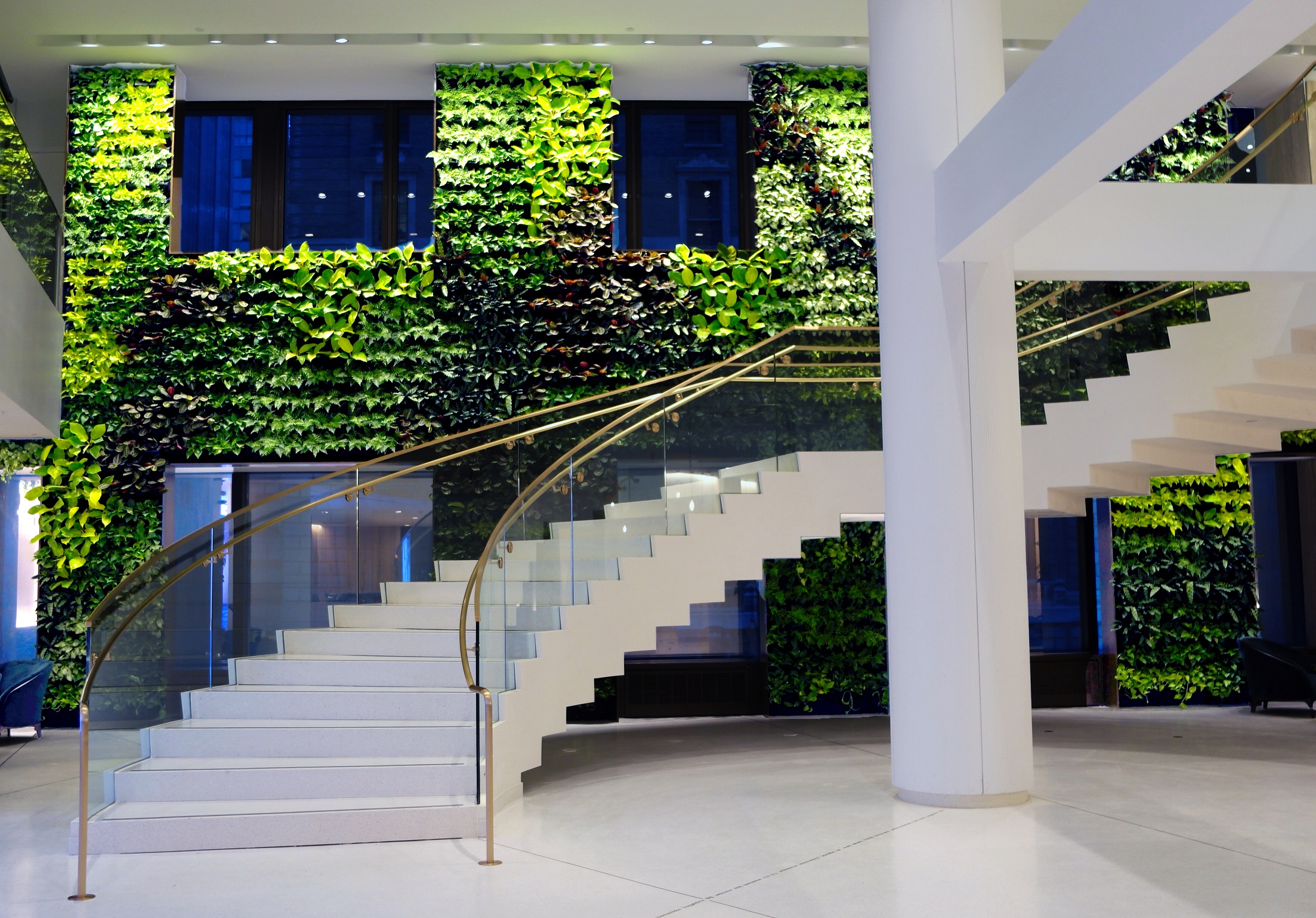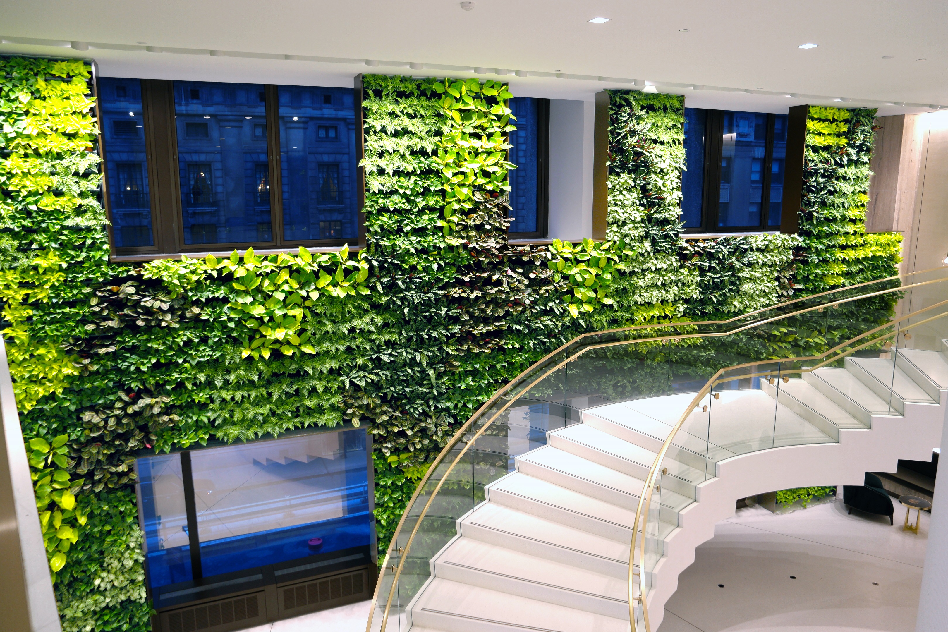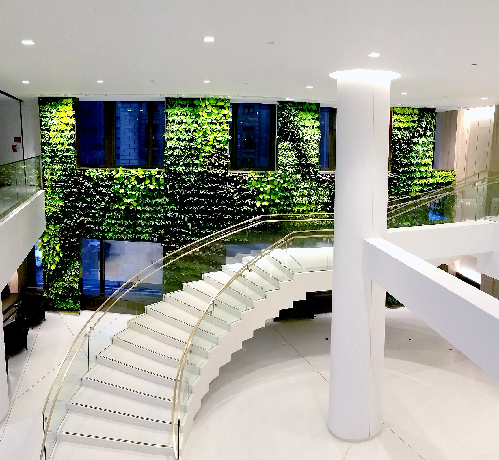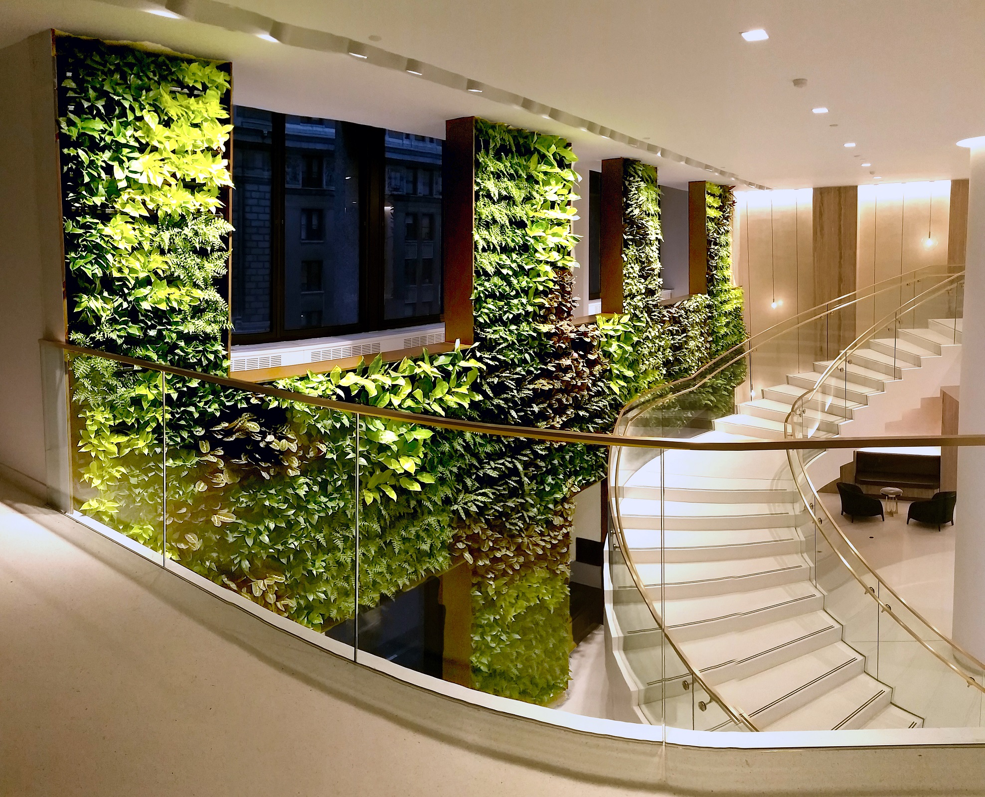 The juxtaposition of organic and rectilinear form of this living wall creates a dynamic backdrop for the centralized atrium and becomes a marriage of contemporary design to the future of New York and its growing green layers.