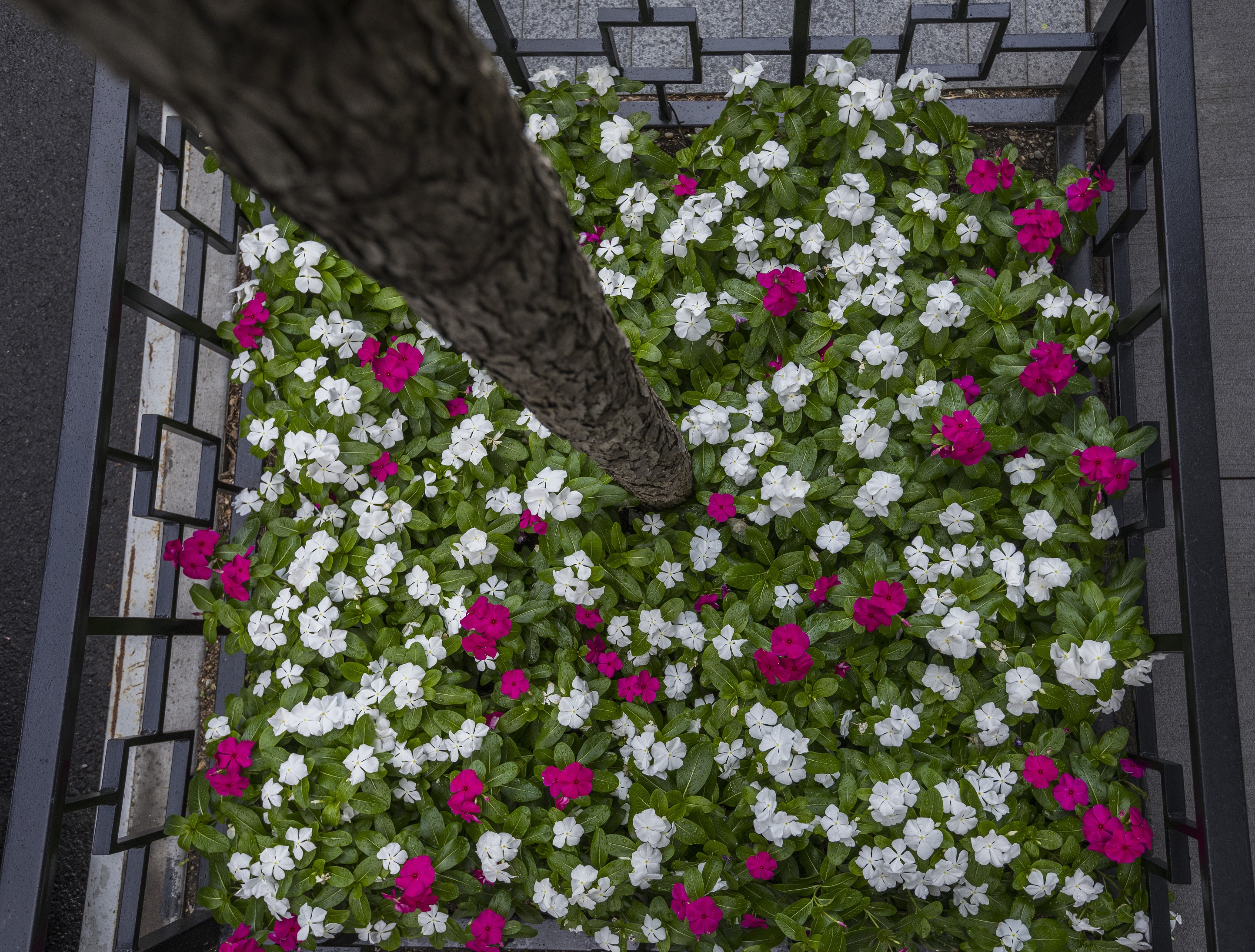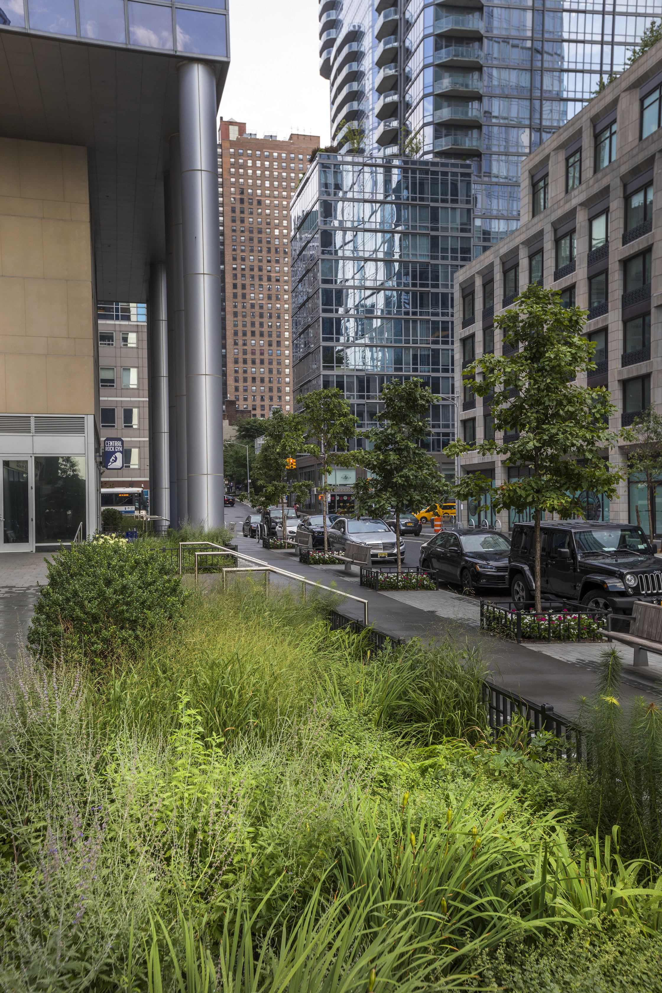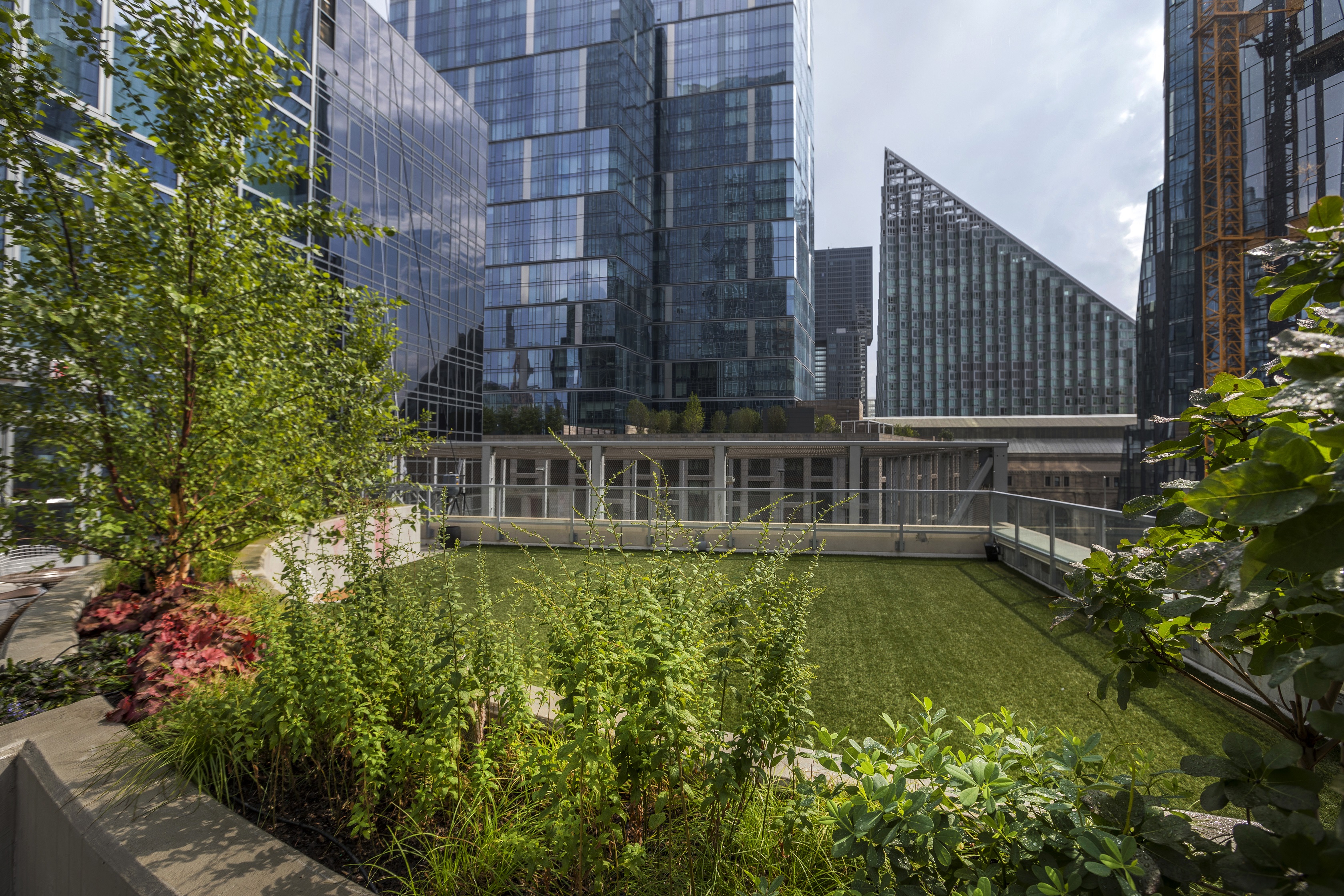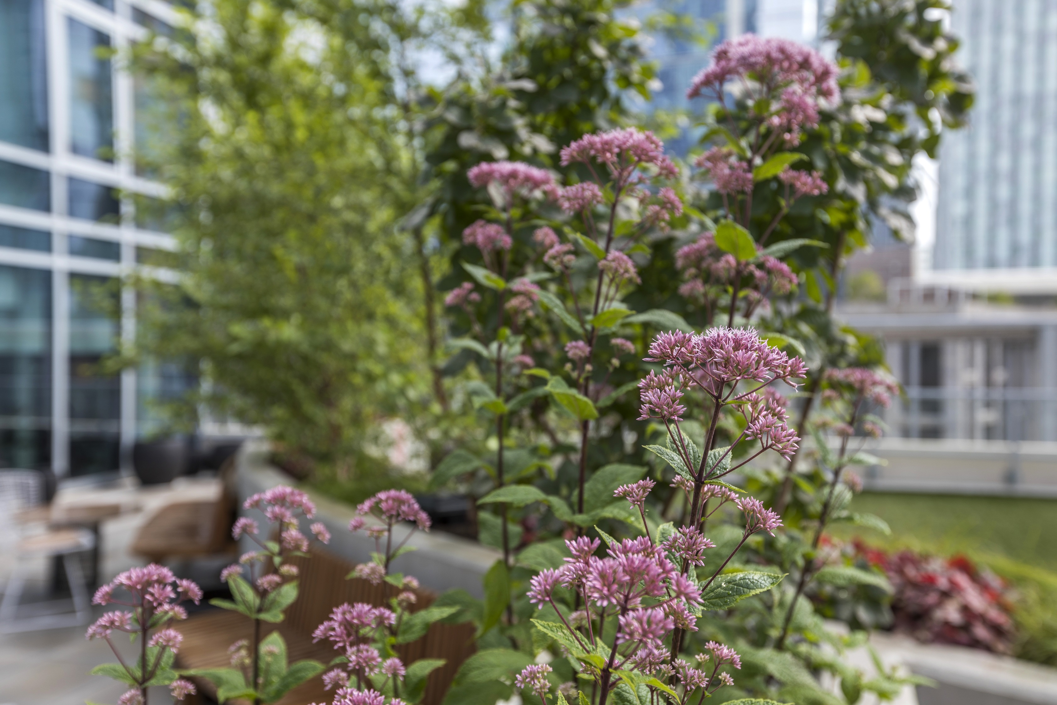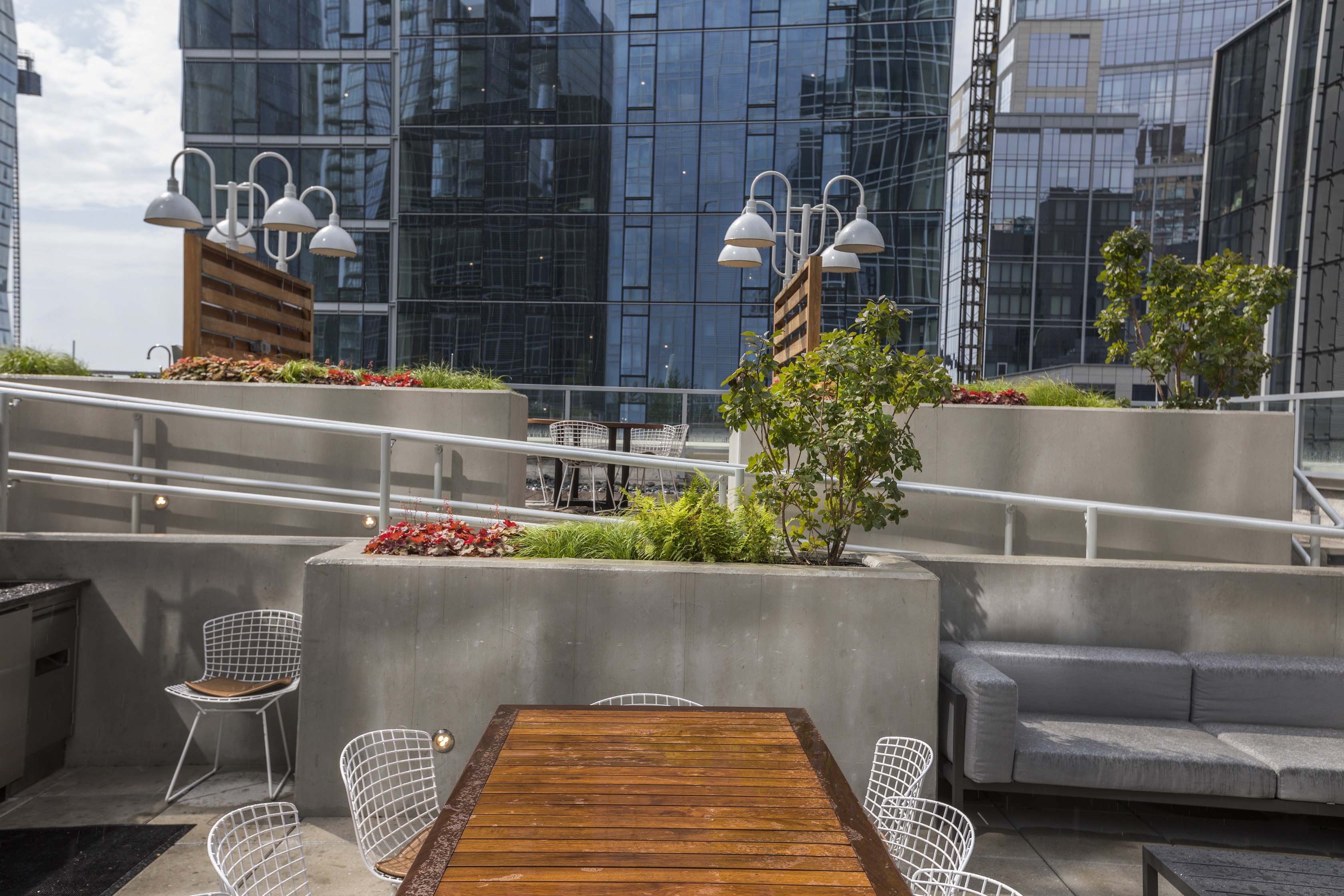 This fun play on levels incorporates different blends of colorful flora in planters that divvy up the rooftop into private retreats, all bordered by the spectacular views of the captivating city architecture.