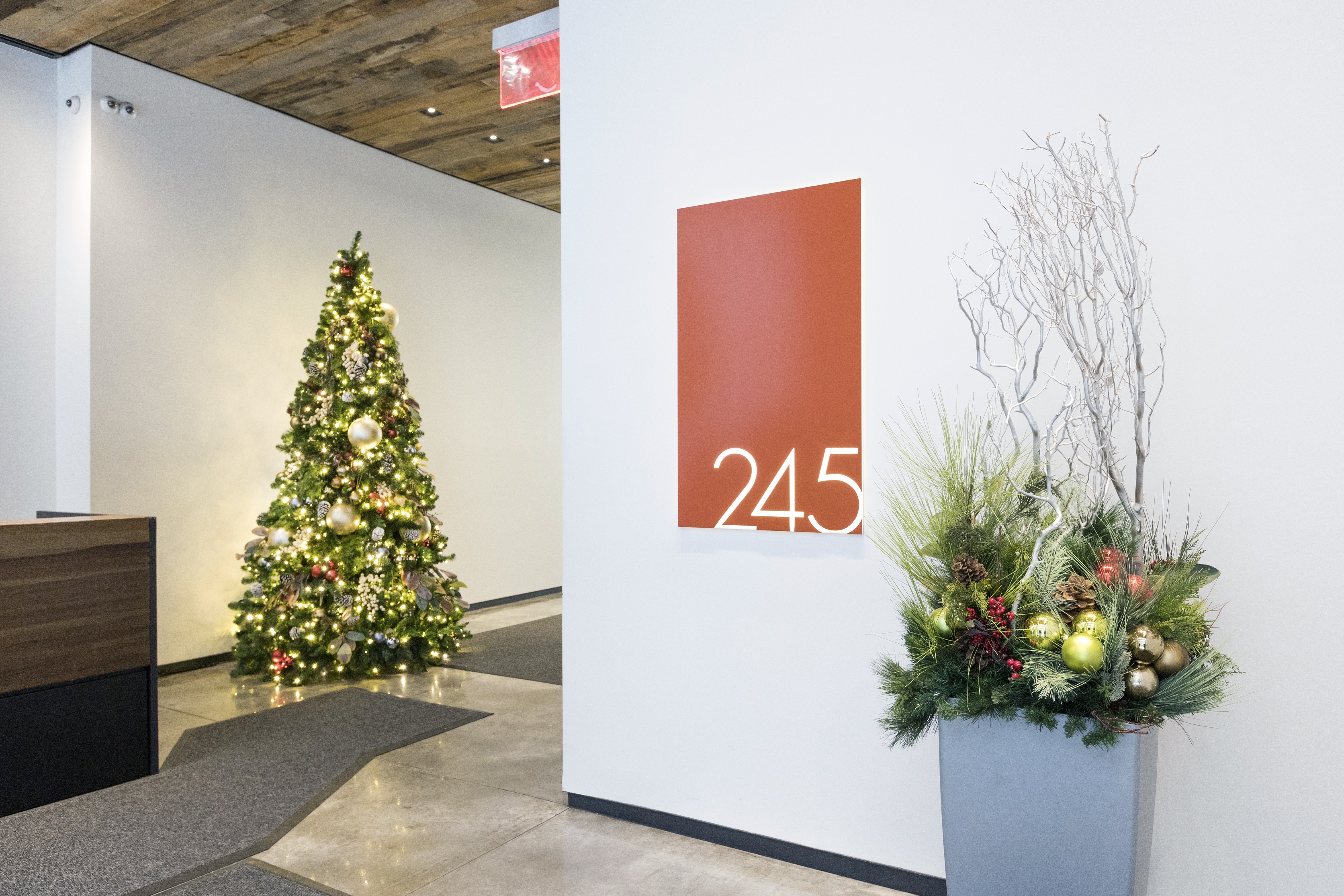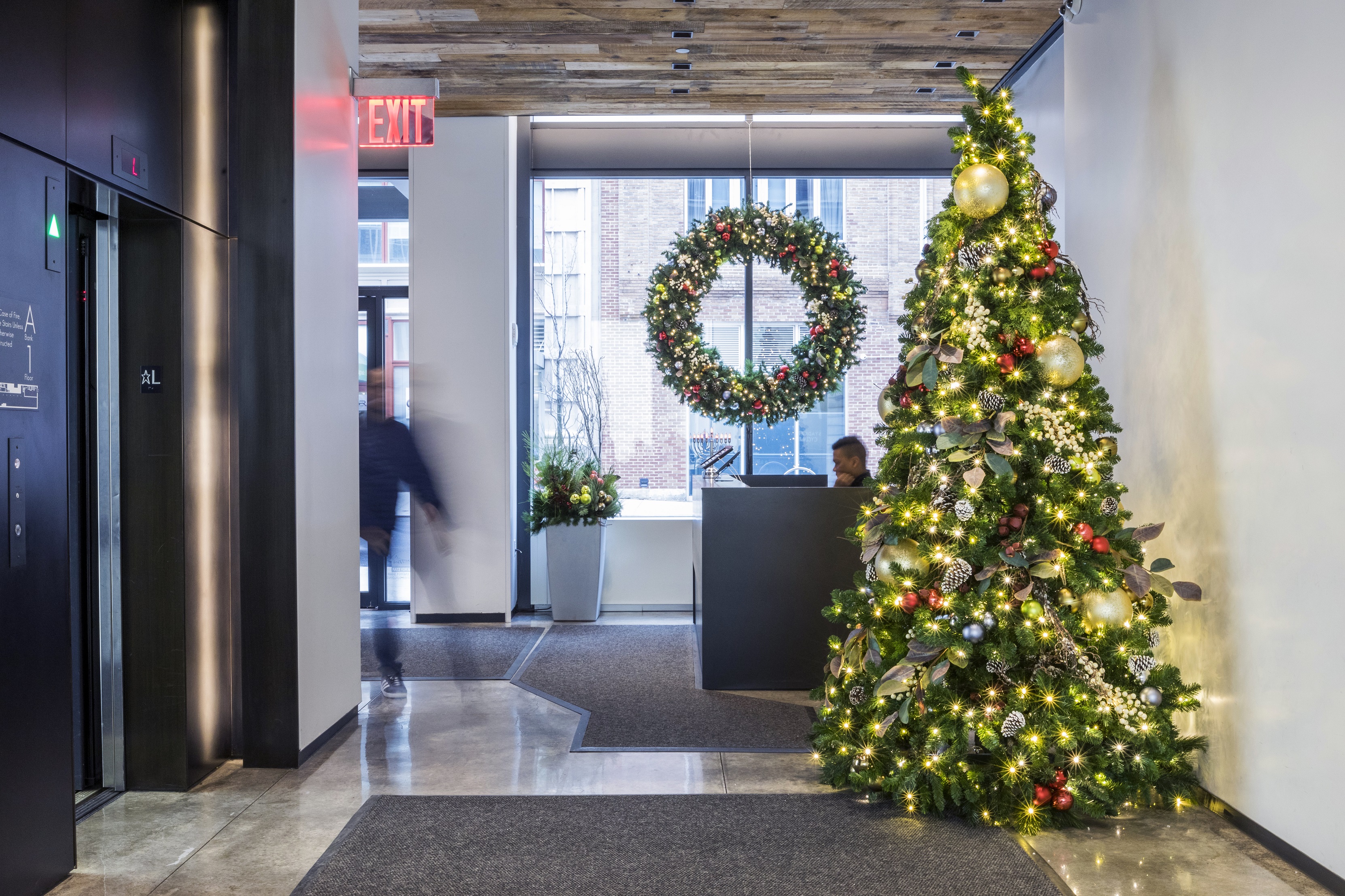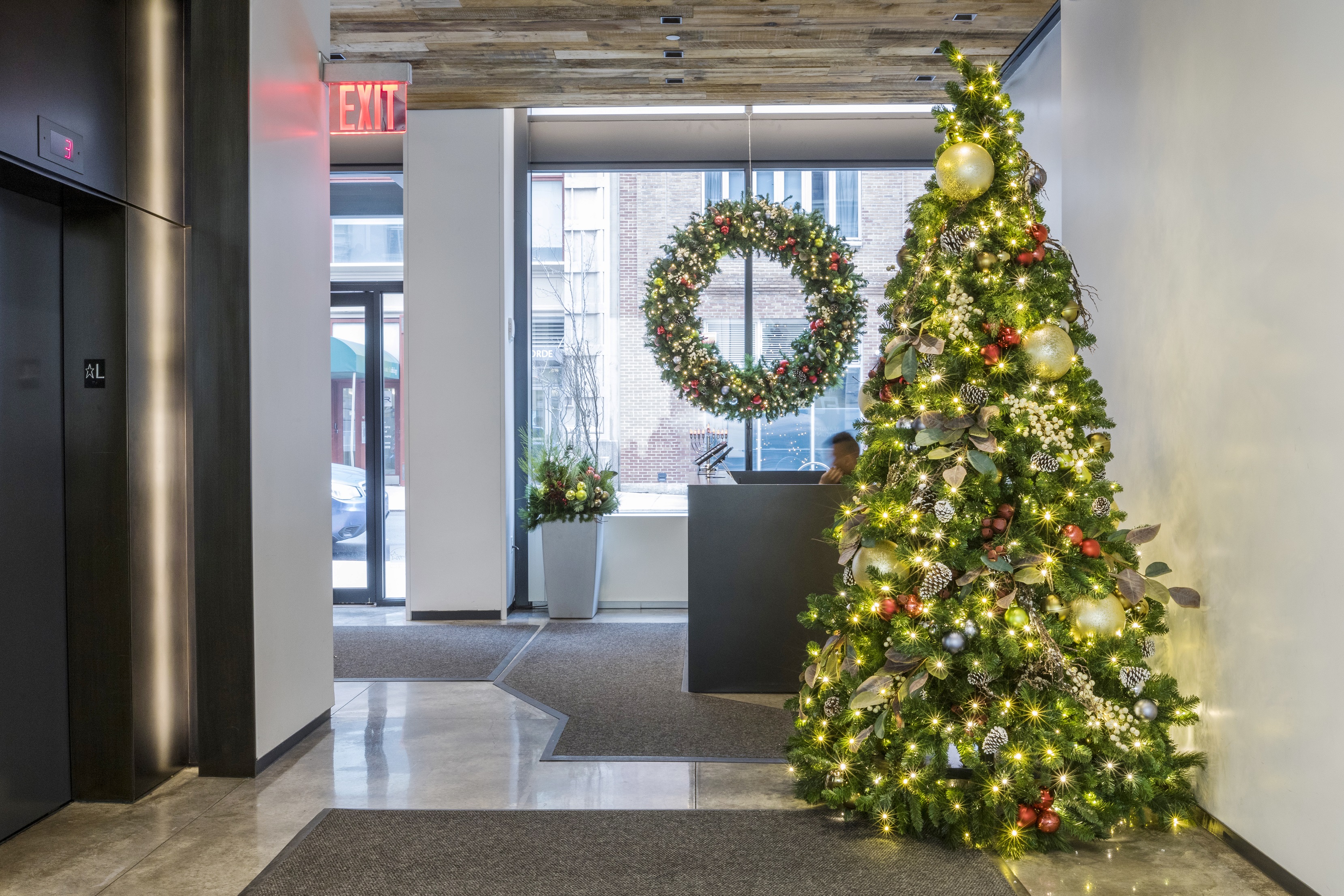 The warm glow of décor, inspired by an upstate NY historic manor, breathes life into this minimalistic lobby. The crisp clean lines of the interior space help to emphasize the charm of the design.