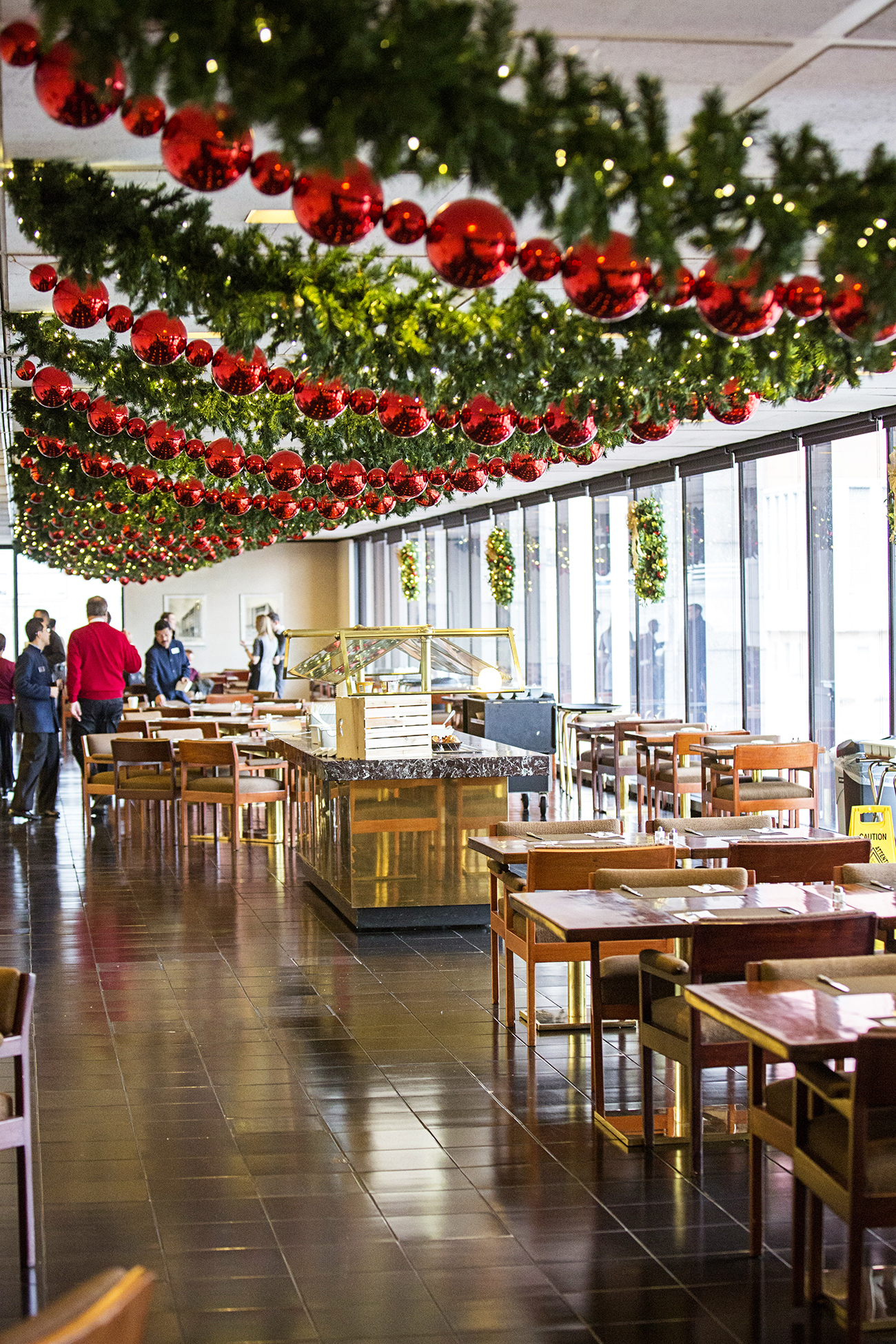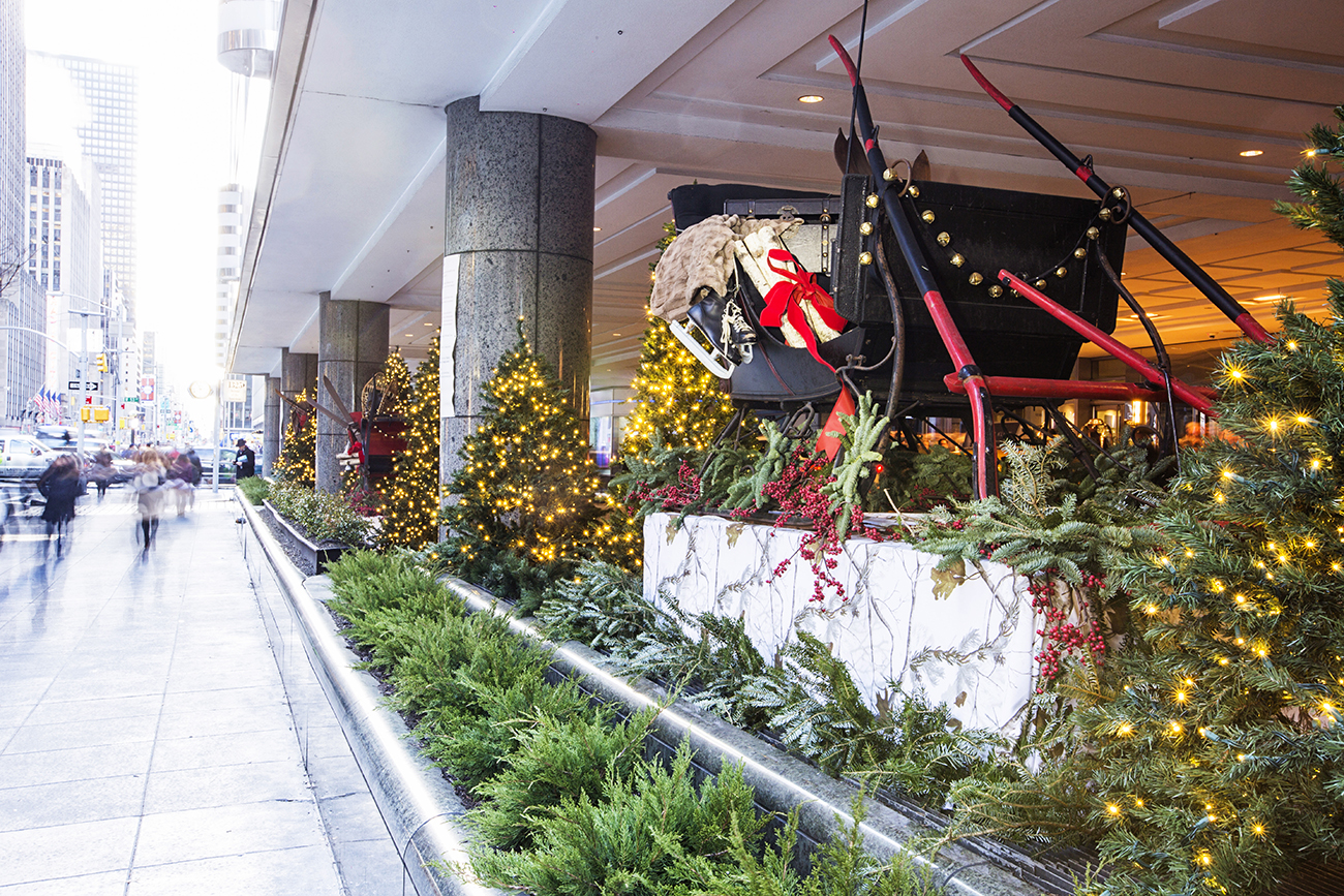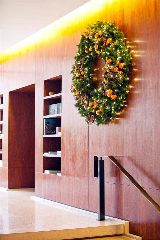 Elegant holiday décor enhances the wood tones of this residential lobby.