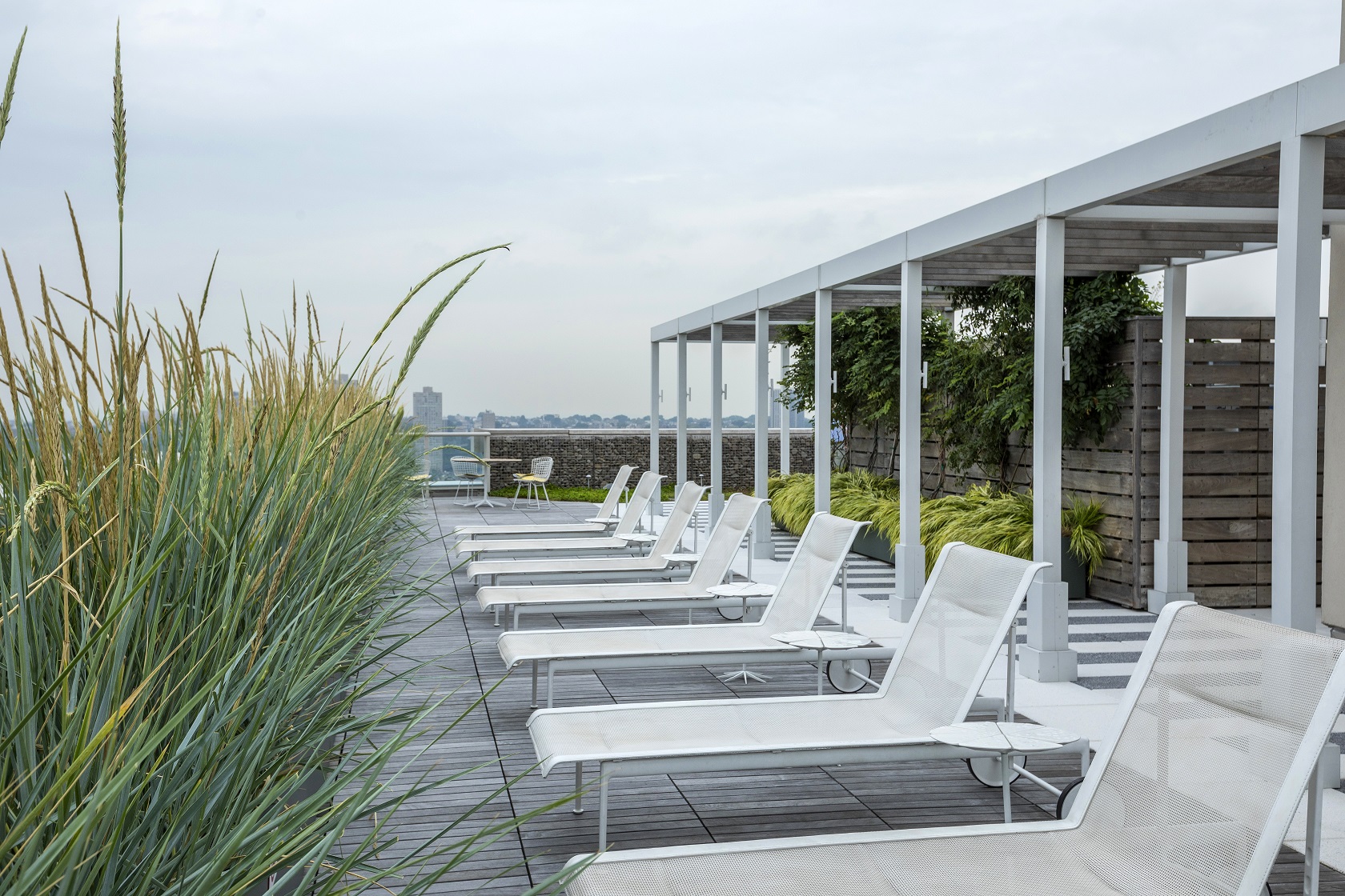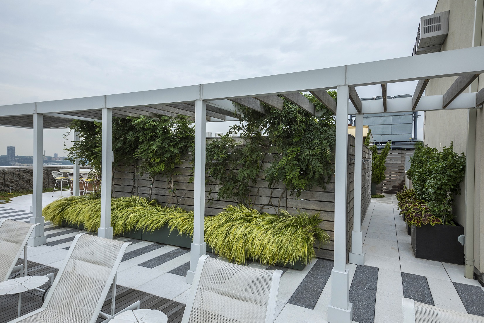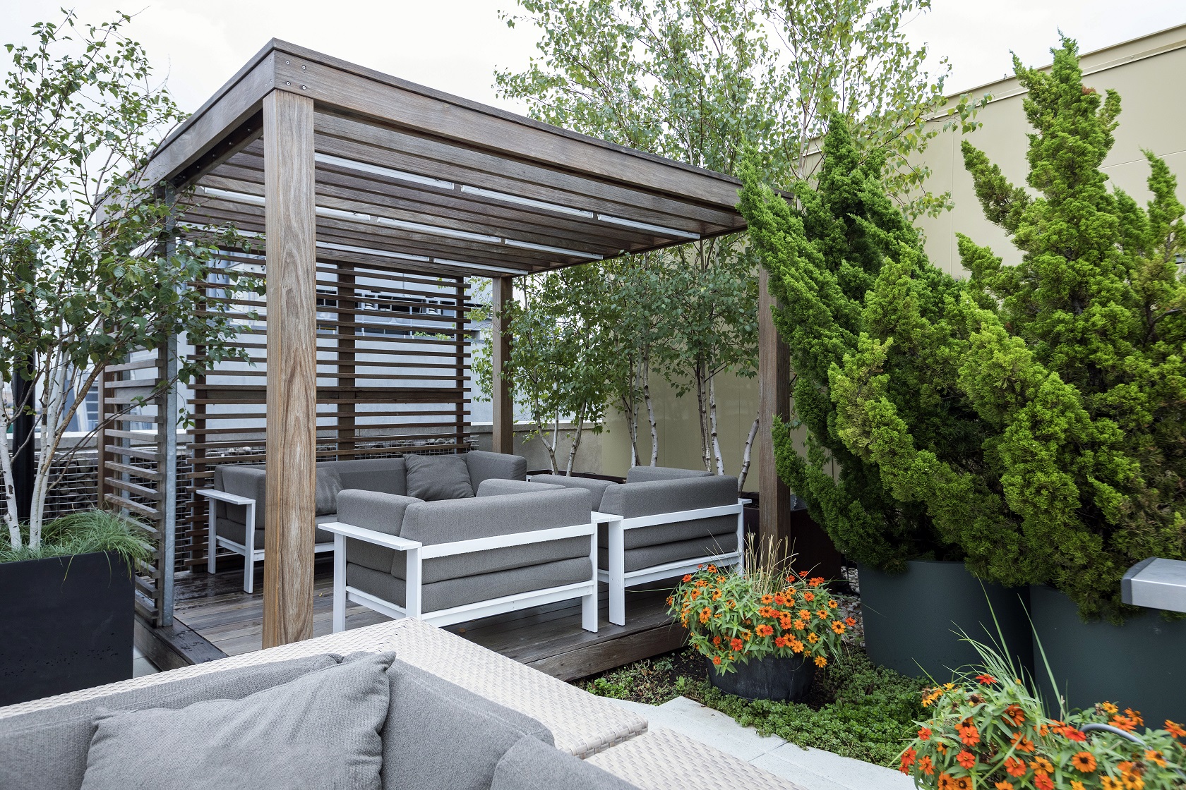 Expertly maintained specimen trees mix with perennials to encompass this sizeable outdoor rooftop, providing entertainment areas and cabana spaces which are enhanced with nature.