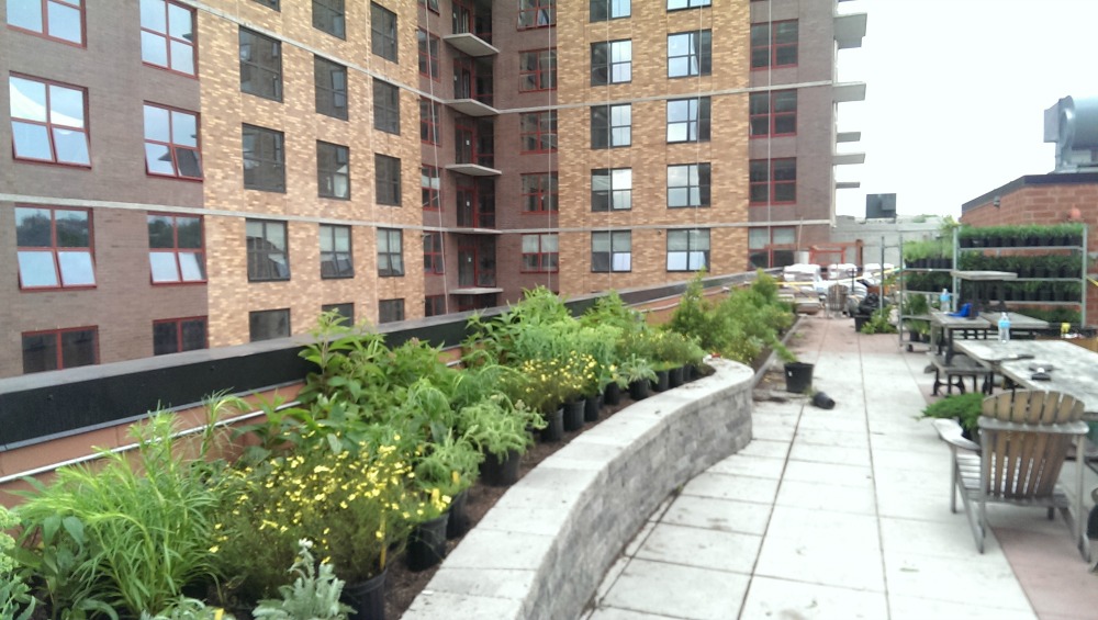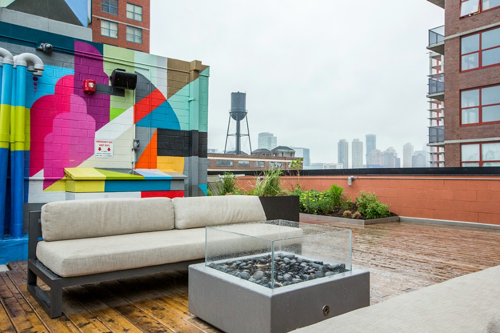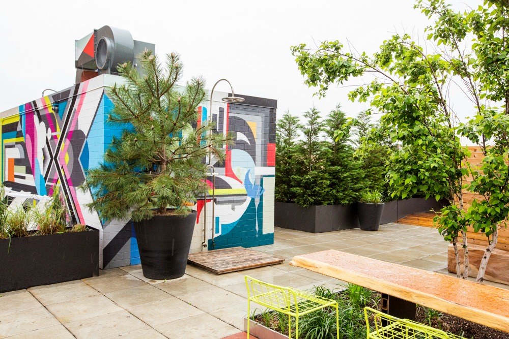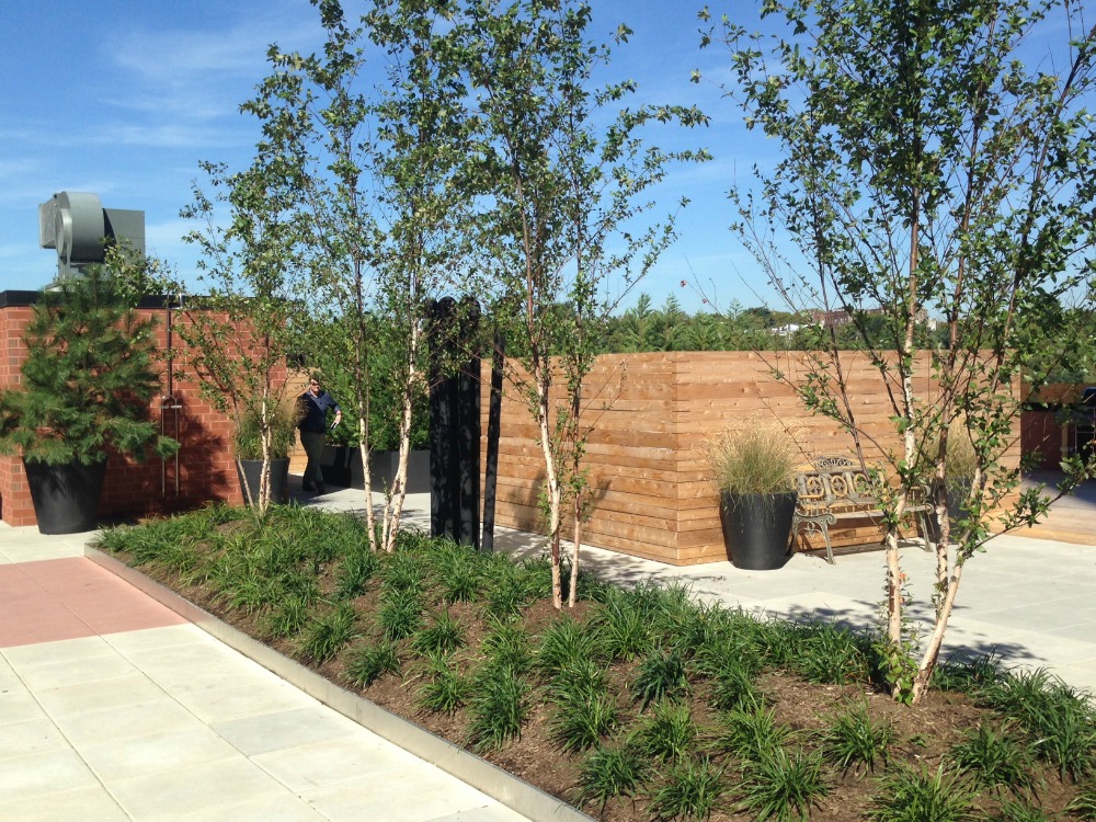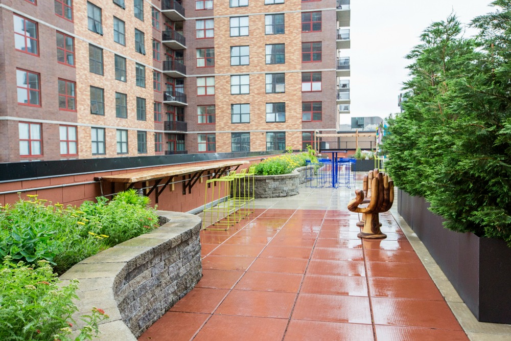This rooftop garden redesign combines colorful perennials and plantings for privacy screenings, providing the residents with a dog run, fire pit, grilling stations, children's play area and a space for private parties.