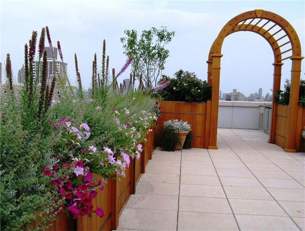 Perennial plantings combined with seasonal plantings and custom wooden arbors frame the views offered by this terrace.