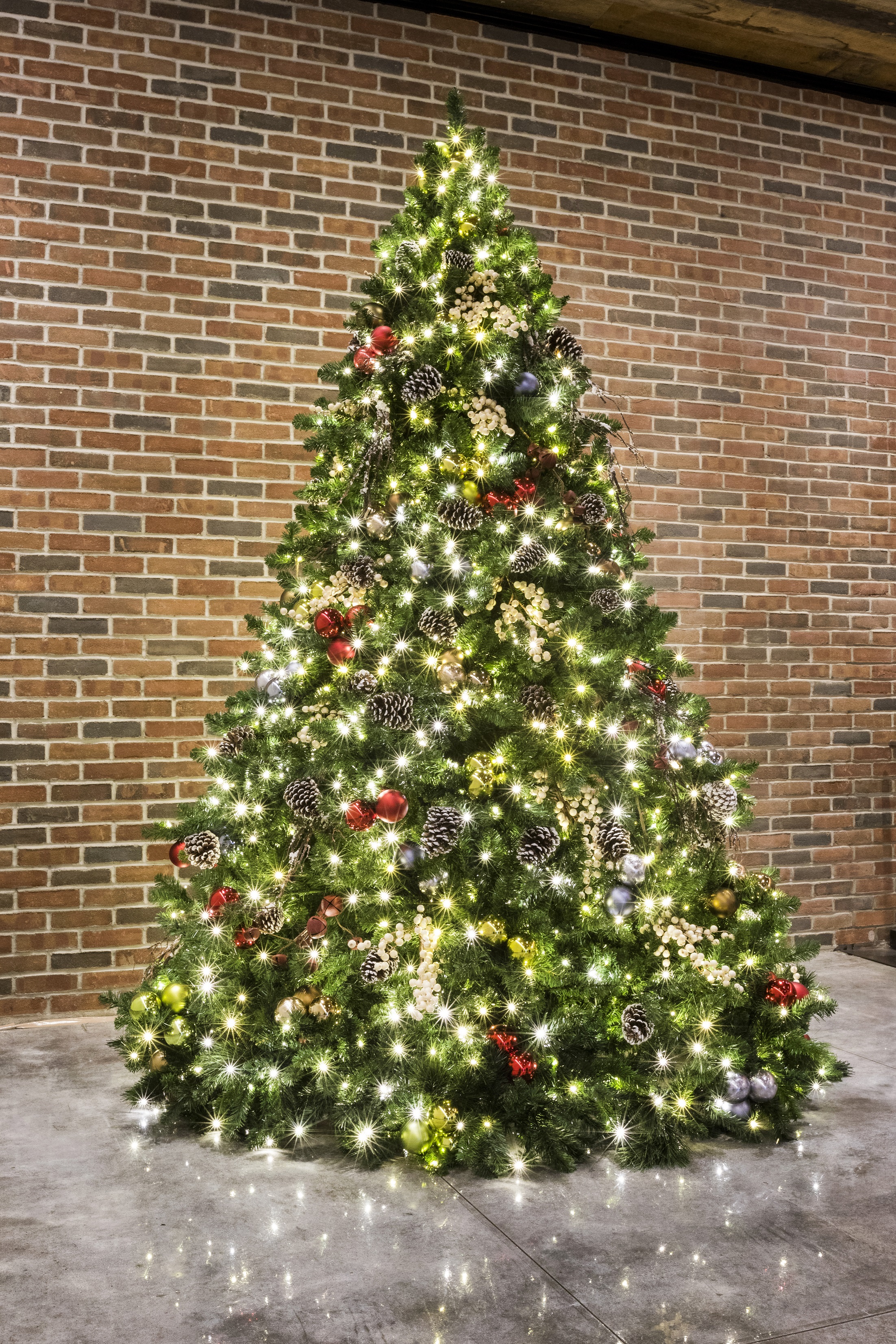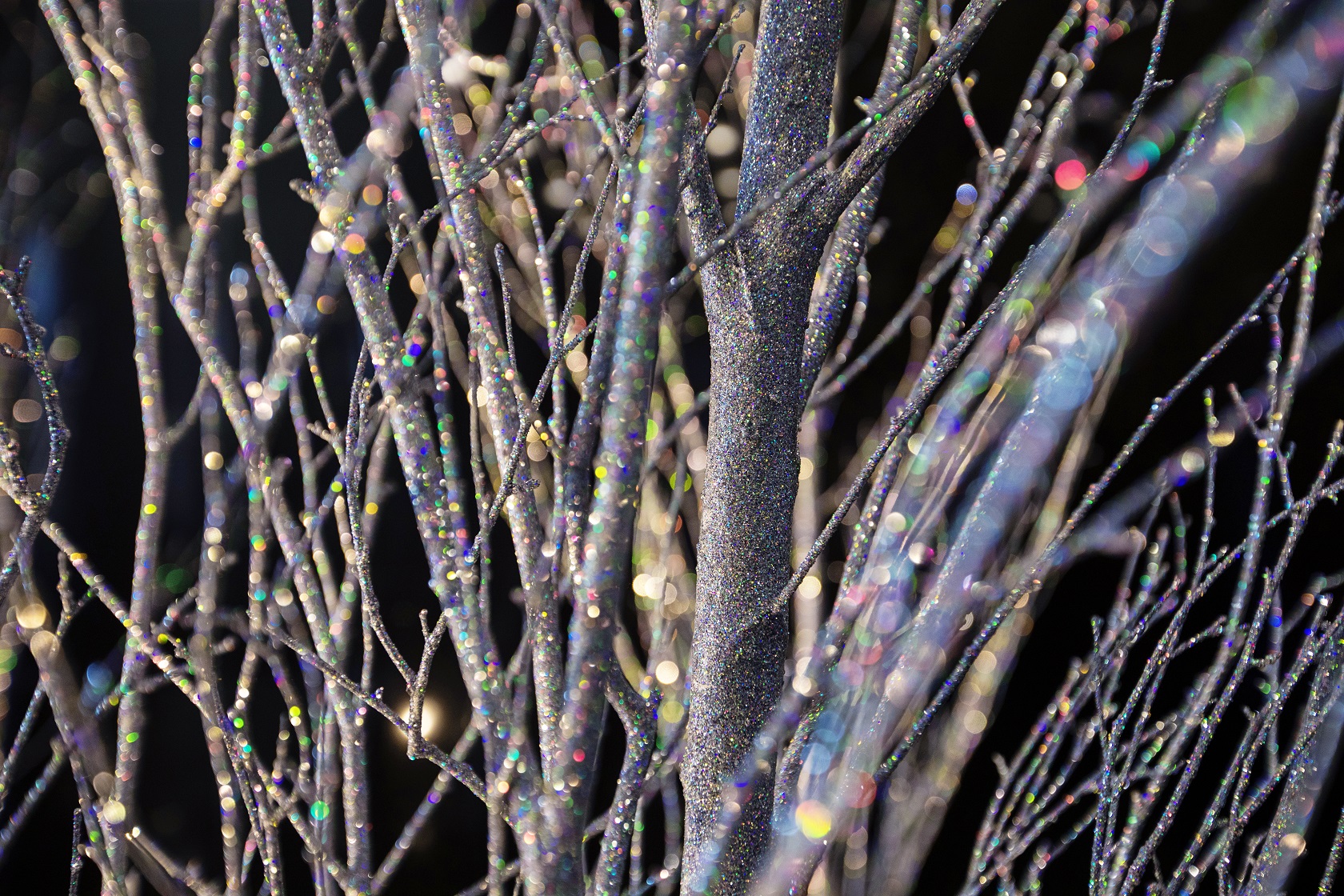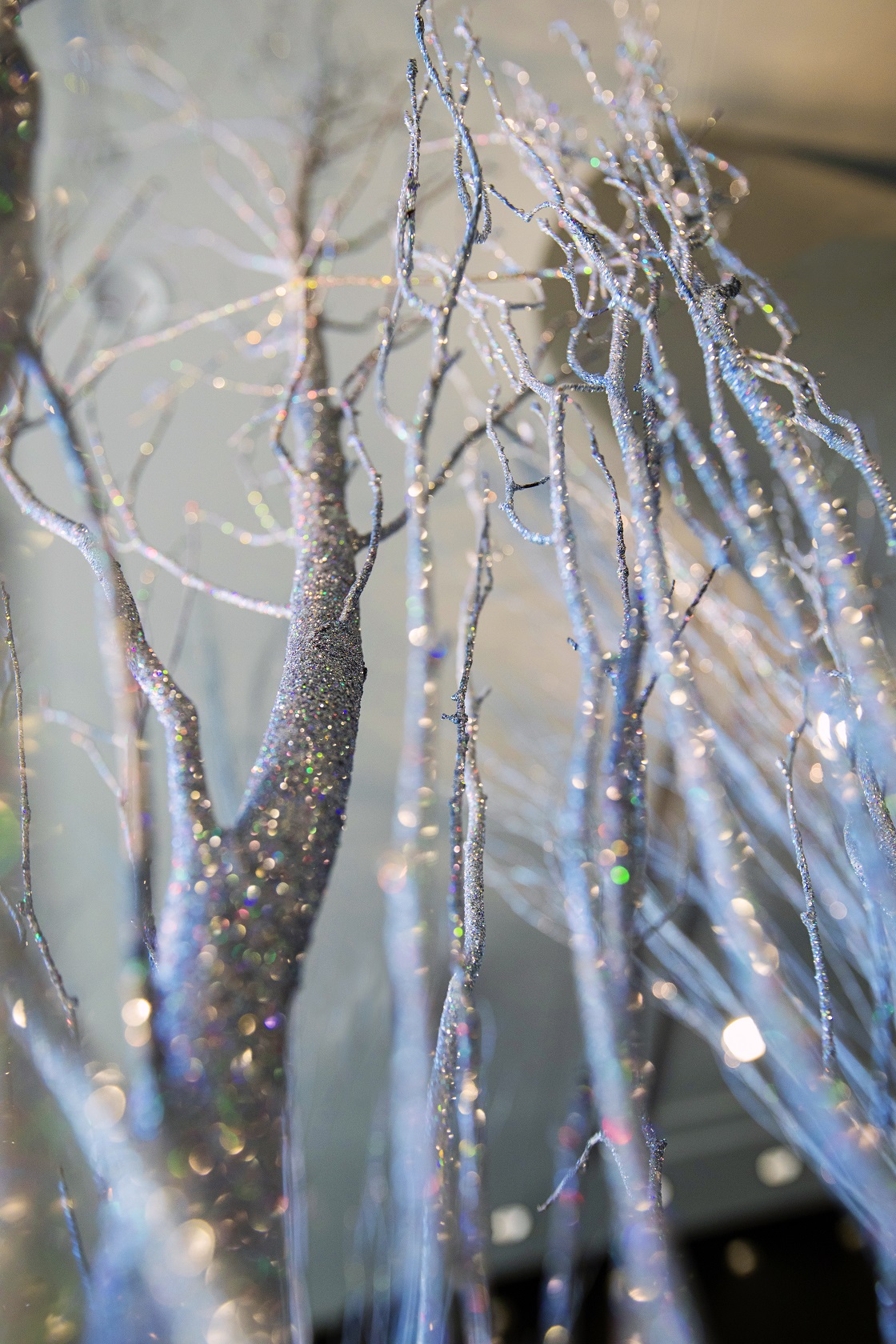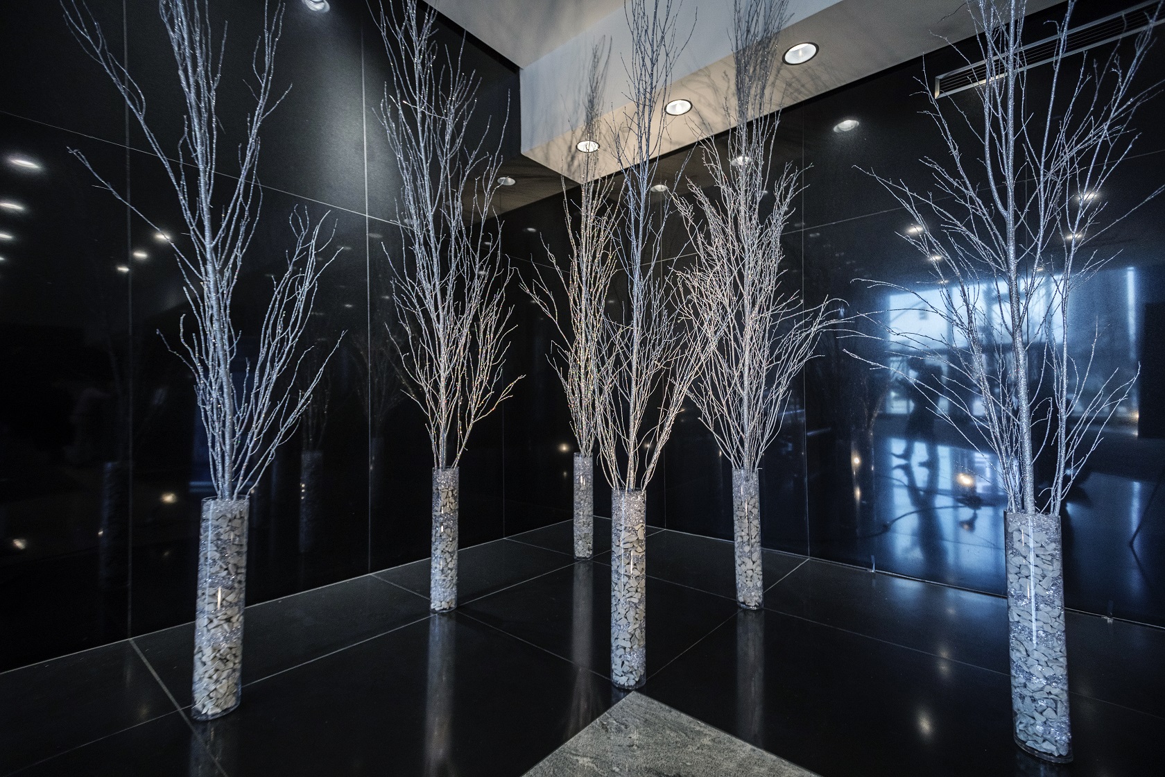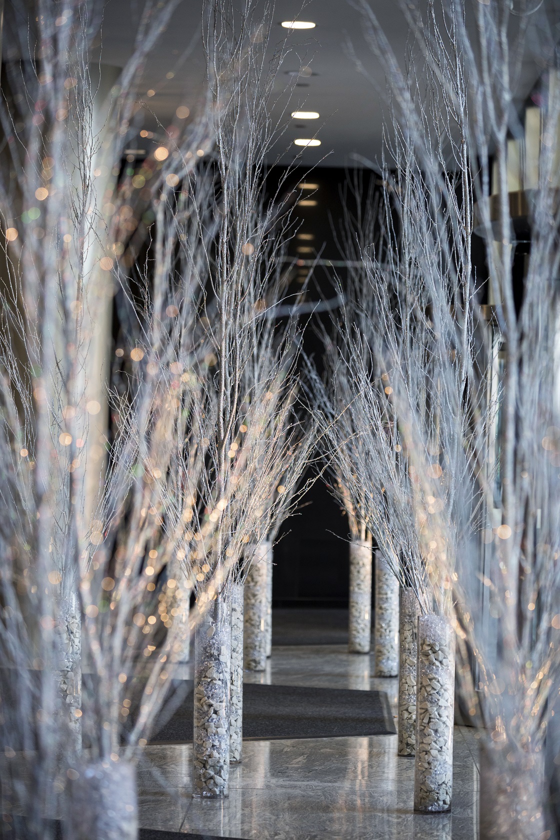 A contemporary display of sparkling birch in glass transports you to a northern forest during a winter frost. These brilliant elements provide a beautiful contrast to this dark-toned lobby.