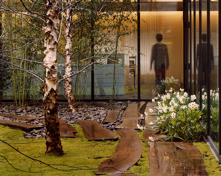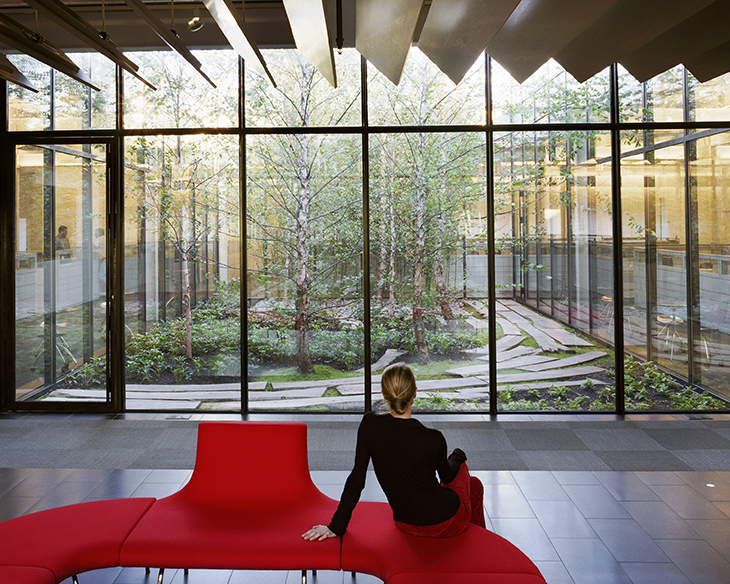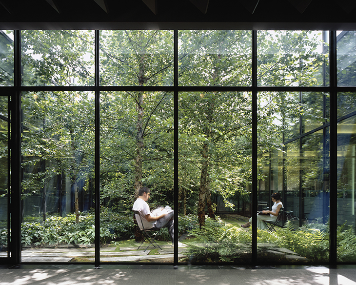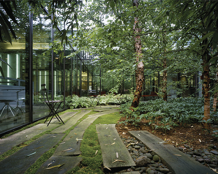 The mirrored courtyards of this office building provide a beautiful view for the workers inside. Moss, river rock, and black locust logs provide a stunning underplanting for the birch trees and bamboo forests.
