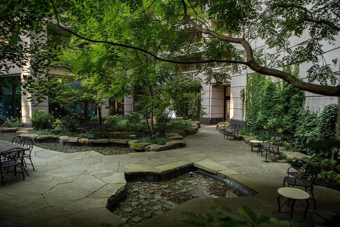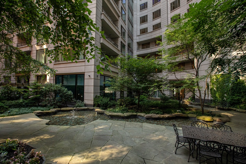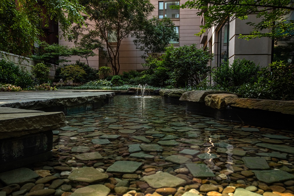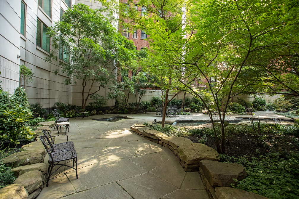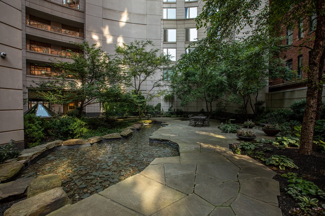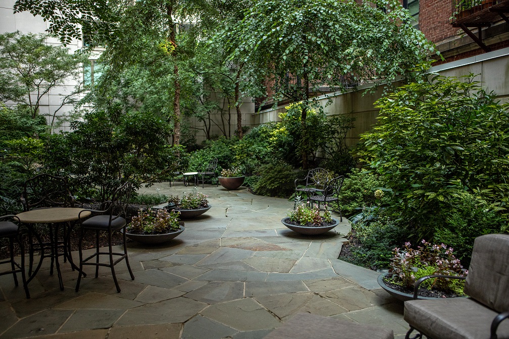 This hidden retreat on the Upper West Side of Manhattan creates a quiet space for residents to unwind and enjoy the tranquility of nature. A unique water feature acts at the centerpiece to this beautiful garden.